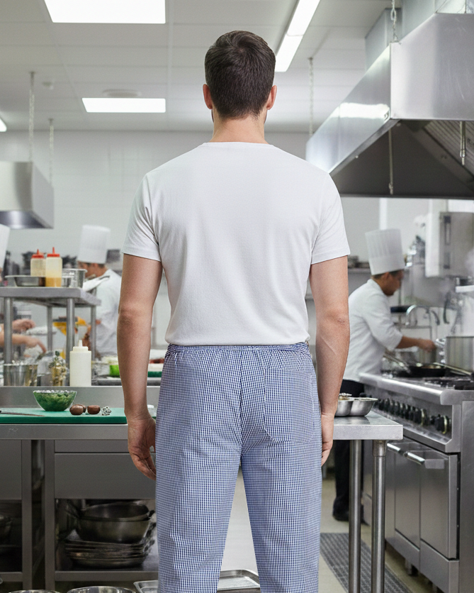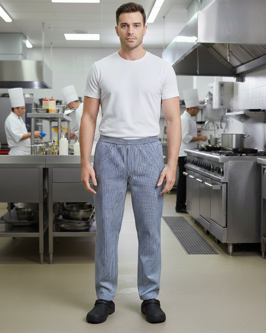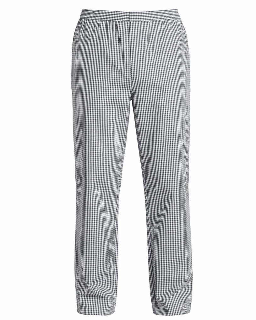 Klasyczne spodnie kucharskie w dwukolorową kratkę. Wciągane i wygodne dzięki elastycznej gumce w pasie. Z tyłu posiadają naszywaną kieszonkę.