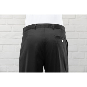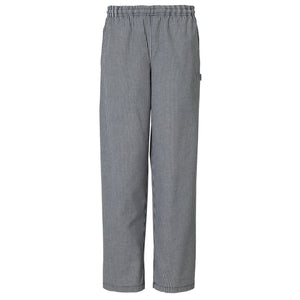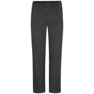 Spodnie dla kucharzy mogą być wyposażone w elastyczną gumę umieszczoną w pasie, wiązane na troczki lub zapinane na guzik i zamek błyskawiczny.