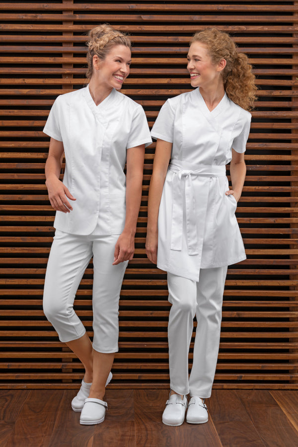 Wygodne, łatwe w pielęgnacji spodnie damskie z 5 kieszeniami i elastycznym paskiem z dzianiny, którego szerokość można regulować za pomocą gumki. Krój dopasowany. 96% bawełna, 4% elastan. Pranie w 40°. Wewnętrzna długość nogawki: 80 cm w rozmiarze 36