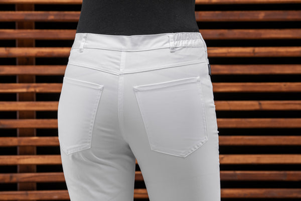 Wygodne spodnie damskie wykonane z łatwego w pielęgnacji, wytrzymałego materiału. Klasyczny krój z 5 kieszeniami: dwie naszywane kieszenie z tyłu, dwie okrągłe kieszenie z przodu i kieszonka na monety po prawej stronie. Elastyczne ściągacze po bokach. Wygodny krój z prostą nogawką. 65% poliester, 35% bawełna. 240 g/m². Pranie w 60°. Wewnętrzna długość nogawki: 80 cm w rozmiarze 36.