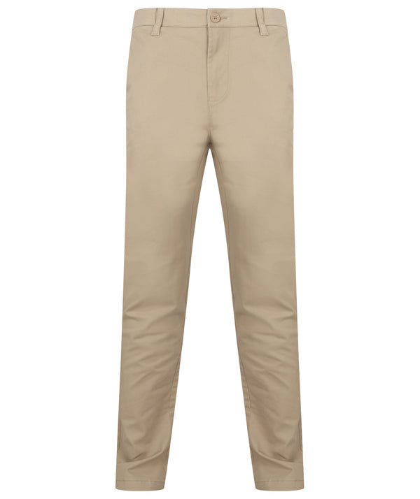 Spodnie męskie typu chino o wyszczuplonym kroju. Wyróżnia je elastyczny pas gwarantujący optymalne dopasowanie i wygodę noszenia. Spodnie posiadają dwie kieszenie z przodu i dwie z tyłu oraz szlufki do paska. Tkanina bawełniana z dodatkiem elastanu jest przewiewna i miła dla ciała, a dodatkowo zapewnia swobodę ruchu.