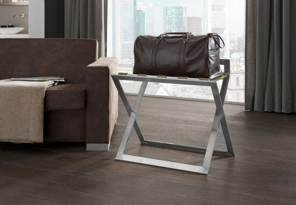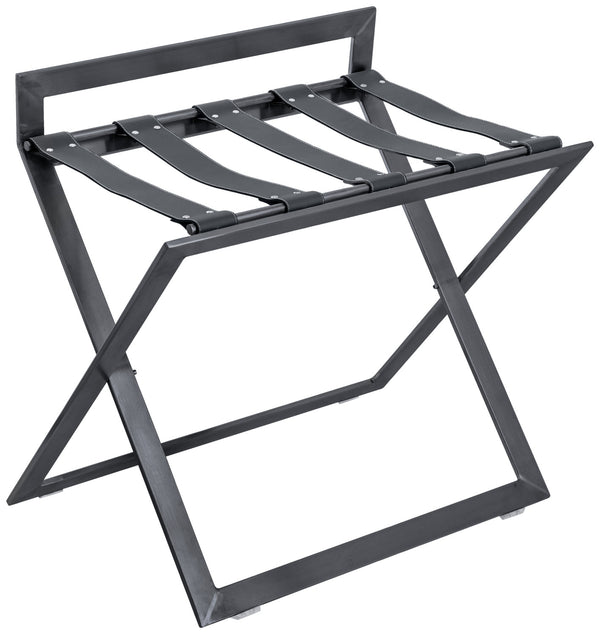 Składany stojak na walizki wykonany z malowanej proszkowo stali nierdzewnej i nitowanych pasków z imitacji skóry. Stojak jest łatwy w obsłudze i niezwykle funkcjonalny. Wymiary półki: 43x60 cm. Wytrzymuje obciążenie do 50 kg. Ze zintegrowaną listwą zabezpieczającą ścianę i ślizgaczami podłogowymi.