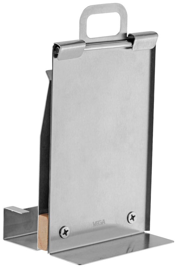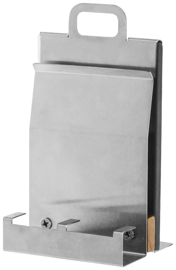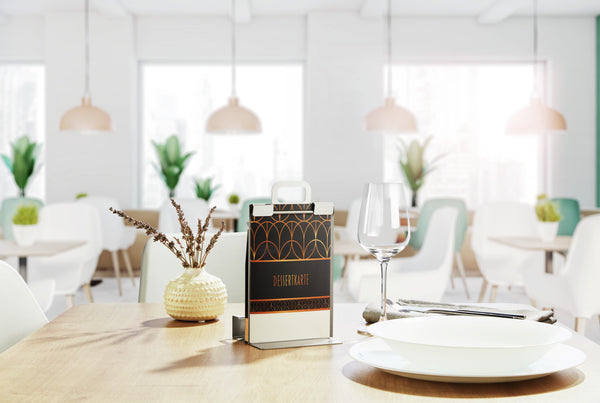 Stojak wykonany ze stali chromowanej 18/0 i prawdziwego drewna. Z zaciskiem na karty menu. Dodatkowy schowek na menu o grubości 1 cm oraz dwa miejsca na solniczkę i pieprzniczkę. Wymiary wnęki 4,2 x 4,2 cm.