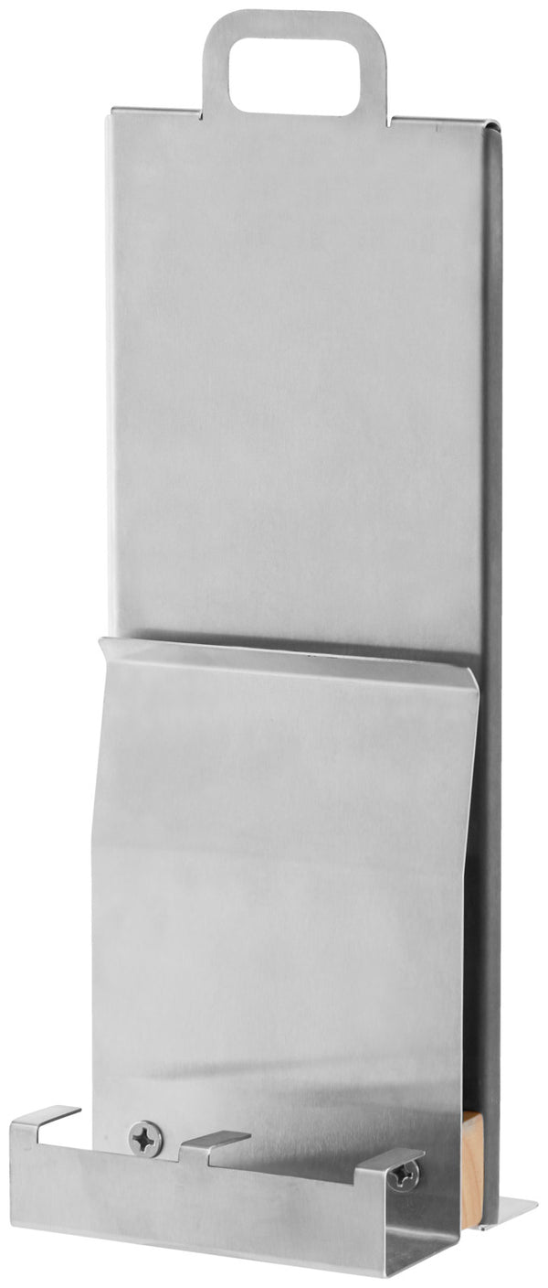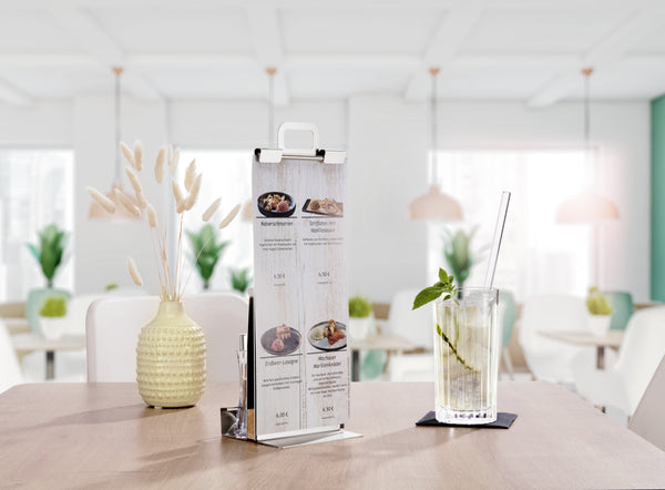 Stojak wykonany ze stali chromowanej 18/0 i prawdziwego drewna. Z zaciskiem na karty menu. Dodatkowy schowek na menu o grubości 1 cm oraz dwa miejsca na solniczkę i pieprzniczkę. Wymiary wnęki 4,2 x 4,2 cm.