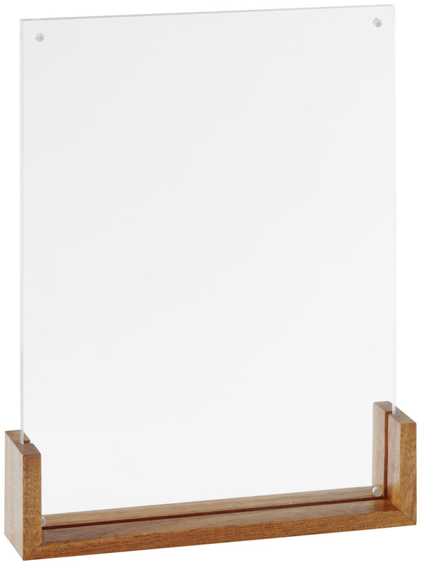 Akrylowy stojak ekspozycyjny z podstawą z prawdziwego drewna. Łatwy do czyszczenia gorącą wodą.