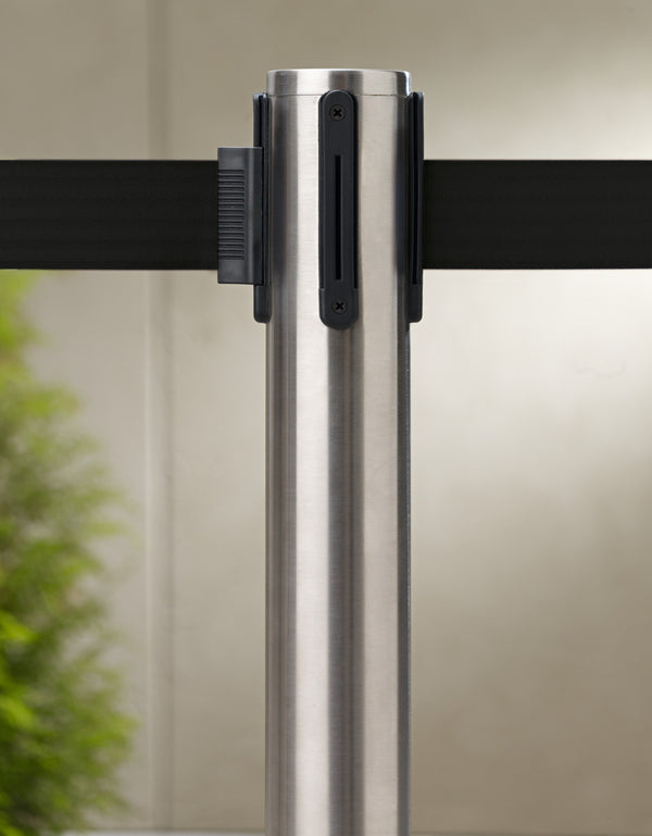 Słupek odgradzający ze stali nierdzewnej ze zintegrowaną taśmą poliestrową. Zmienne odstępy między słupkami dzięki mechanizmowi zwijania. Trzy pozycje zawieszenia dla dowolnej kombinacji słupów. Prosty montaż i obsługa. Do stosowania wewnątrz i na zewnątrz chronionych obszarów. Taśma dostępna w kilku kolorach. Możliwość montażu na ścianie za pomocą dodatkowego elementu. Max. Długość taśmy: 2 m.