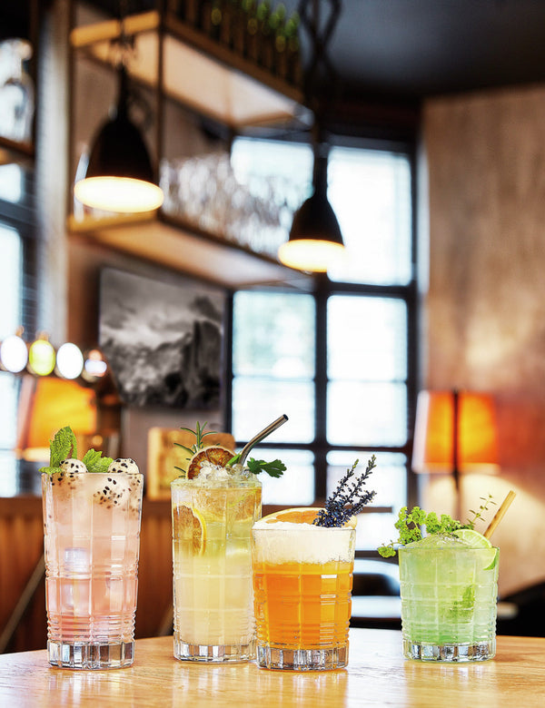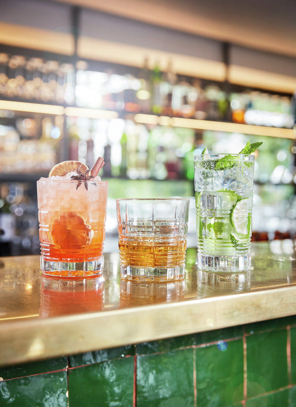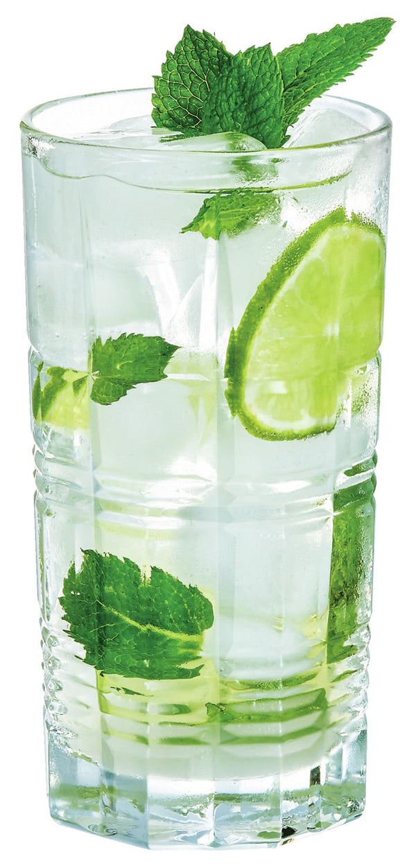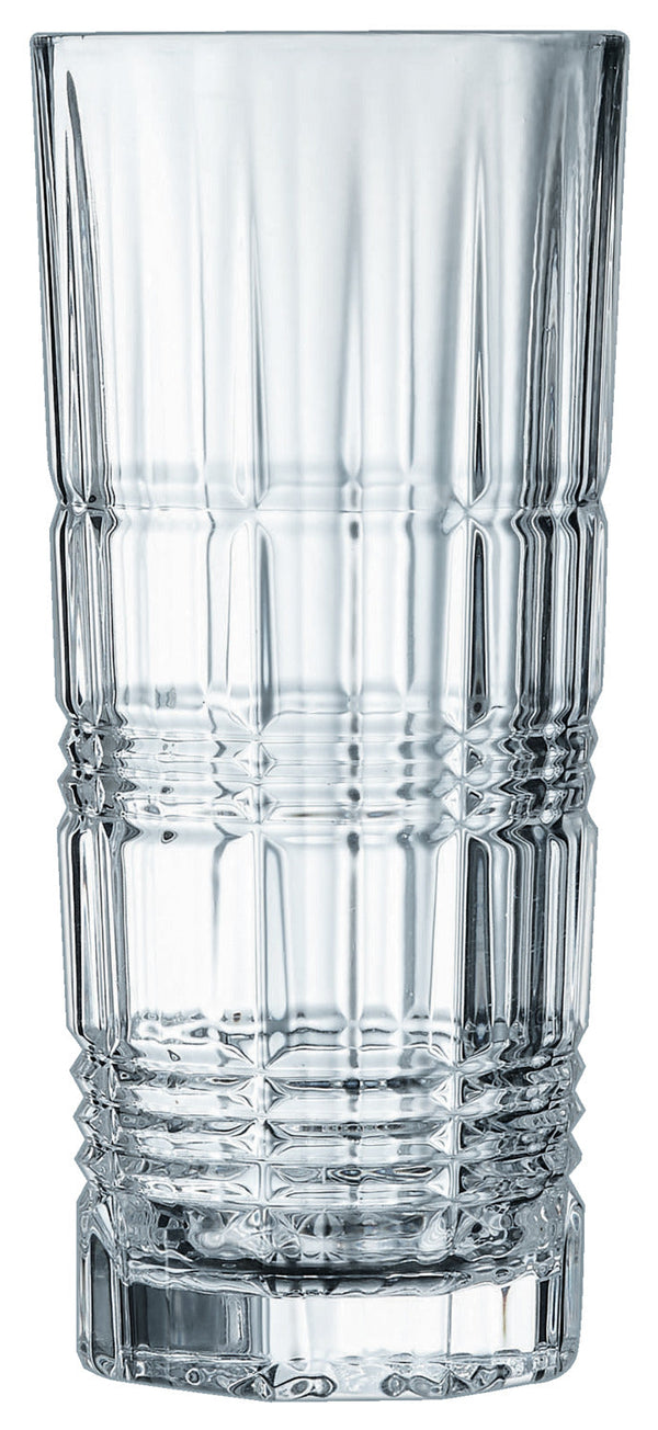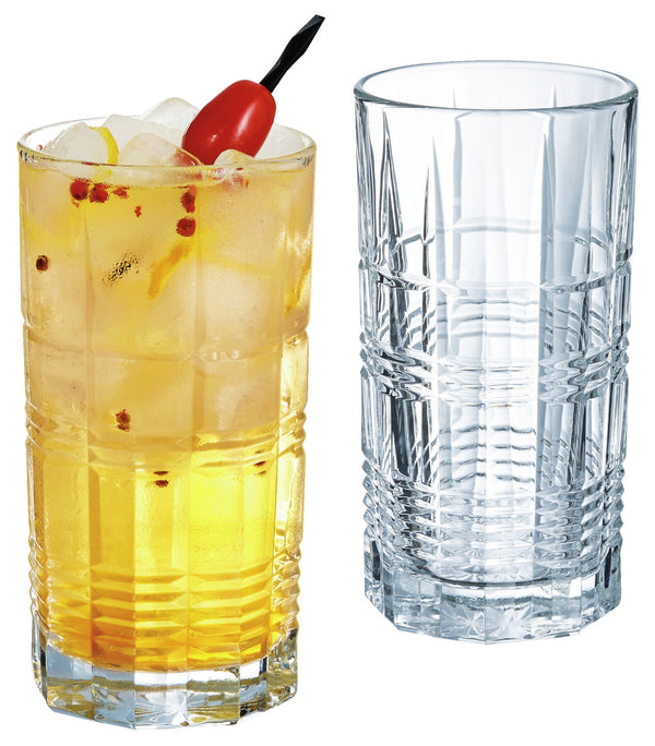 Solidna szklanka do long drinków z nowoczesnym, prostym reliefem. Można myć w zmywarce.