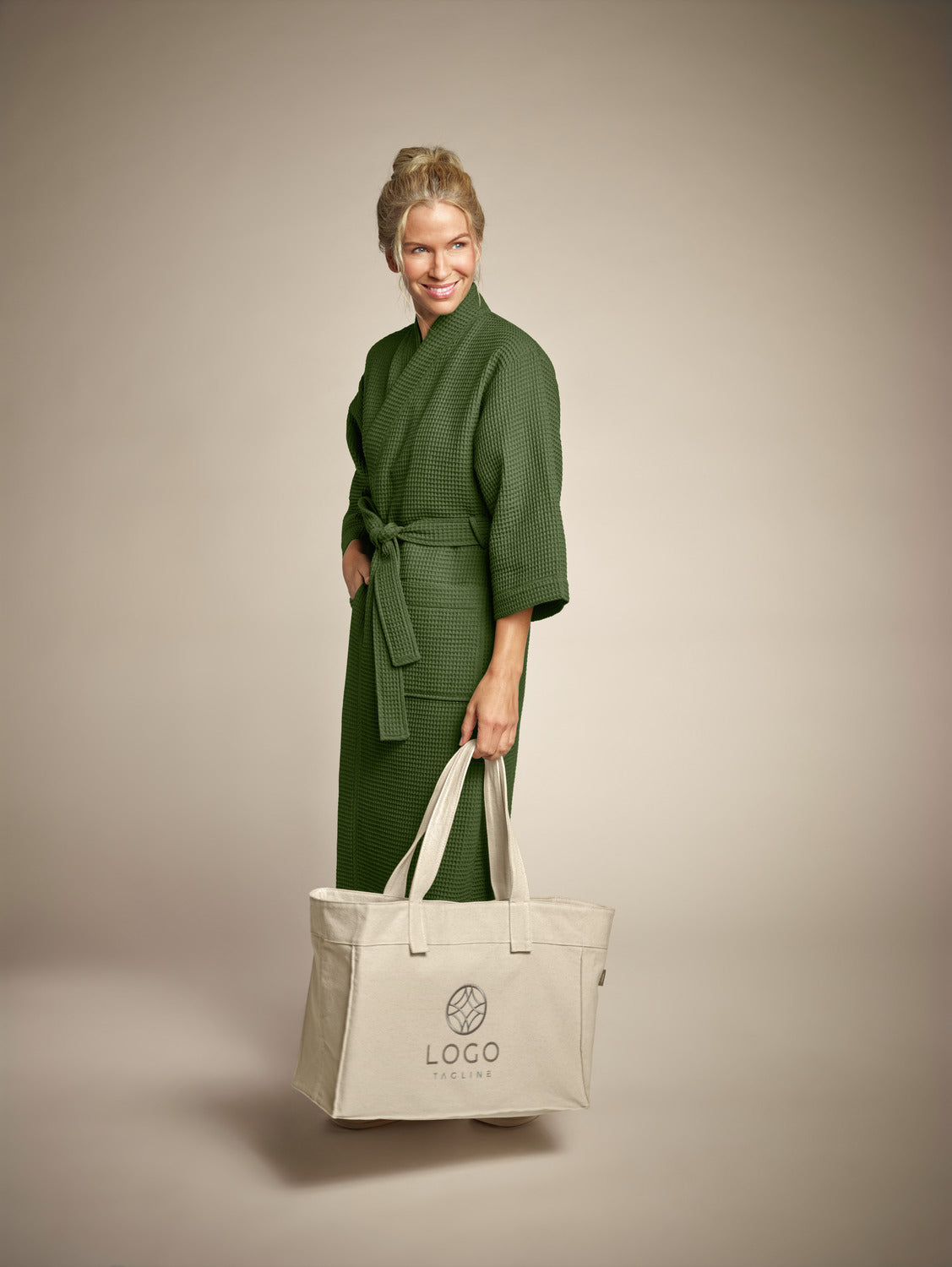 Lekki, wysokiej jakości szlafrok Mino z tkaniny waflowej jest idealnym wyborem dla hoteli i spa. Wykonany w 100% z czystej bawełny, jest wygodny i oddychający w noszeniu oraz wyróżnia się eleganckim wyglądem. Kimonowy krój z rękawami o długości 7/8, dwiema praktycznymi naszywanymi kieszeniami i wiązanym paskiem do indywidualnego dopasowania łączą wygodę i styl. Możliwość personalizacji. Tkanina waflowa 100% bawełny. Gramatura ok. 220 g/m² oferująca lekkość i przewiewność. Szlafrok dostępny w trzech rozmiarach - całkowita długość 126 cm dla rozmiaru L/XL. Dwie naszywane kieszenie. Wiązany pasek do indywidualnego dopasowania. Idealny dla hoteli, spa i ośrodków odnowy biologicznej. Informacje: Produkt osiąga swój ostateczny rozmiar po trzech praniach, ponieważ włókna nadal kurczą się podczas pierwszego prania.