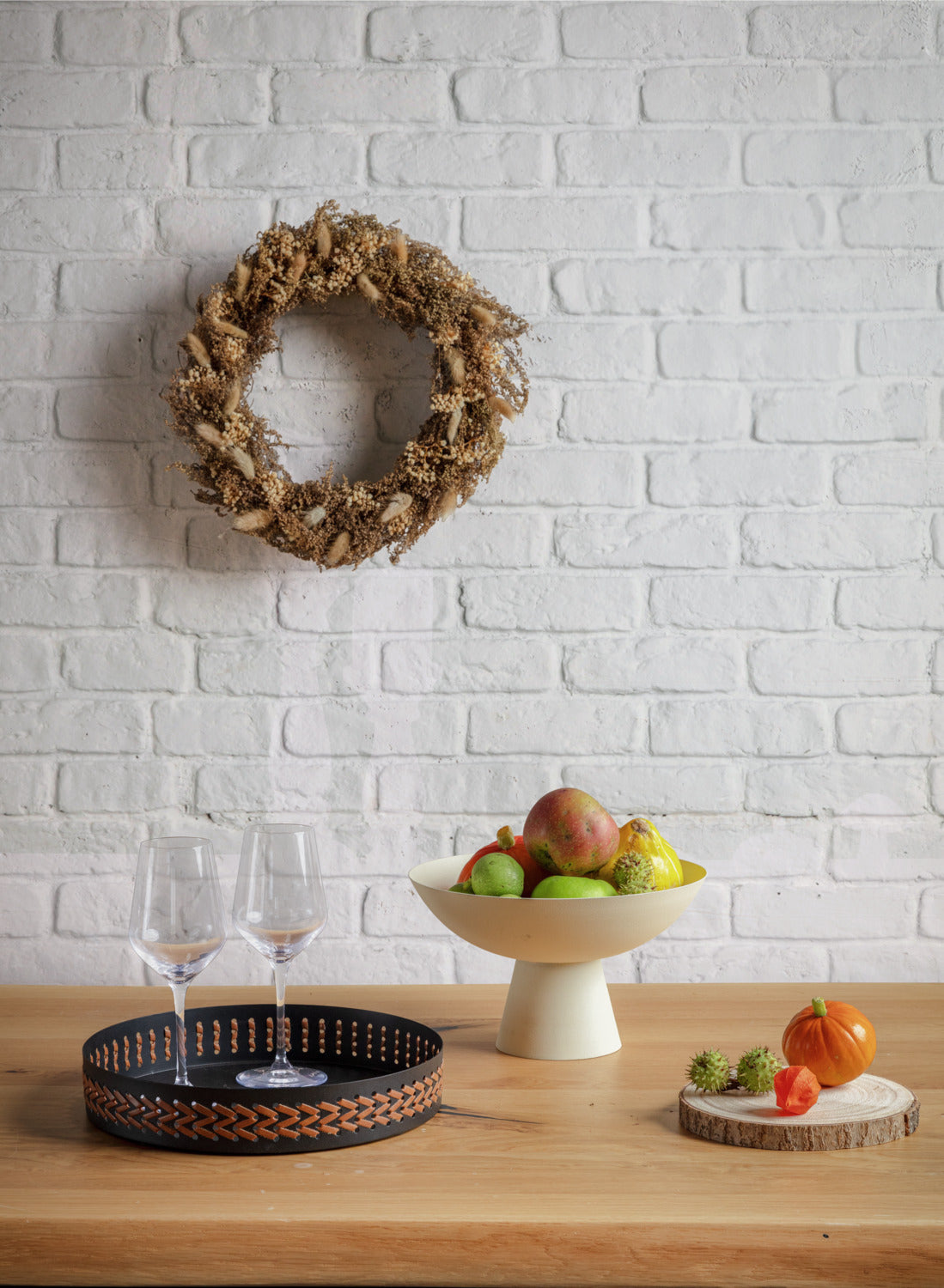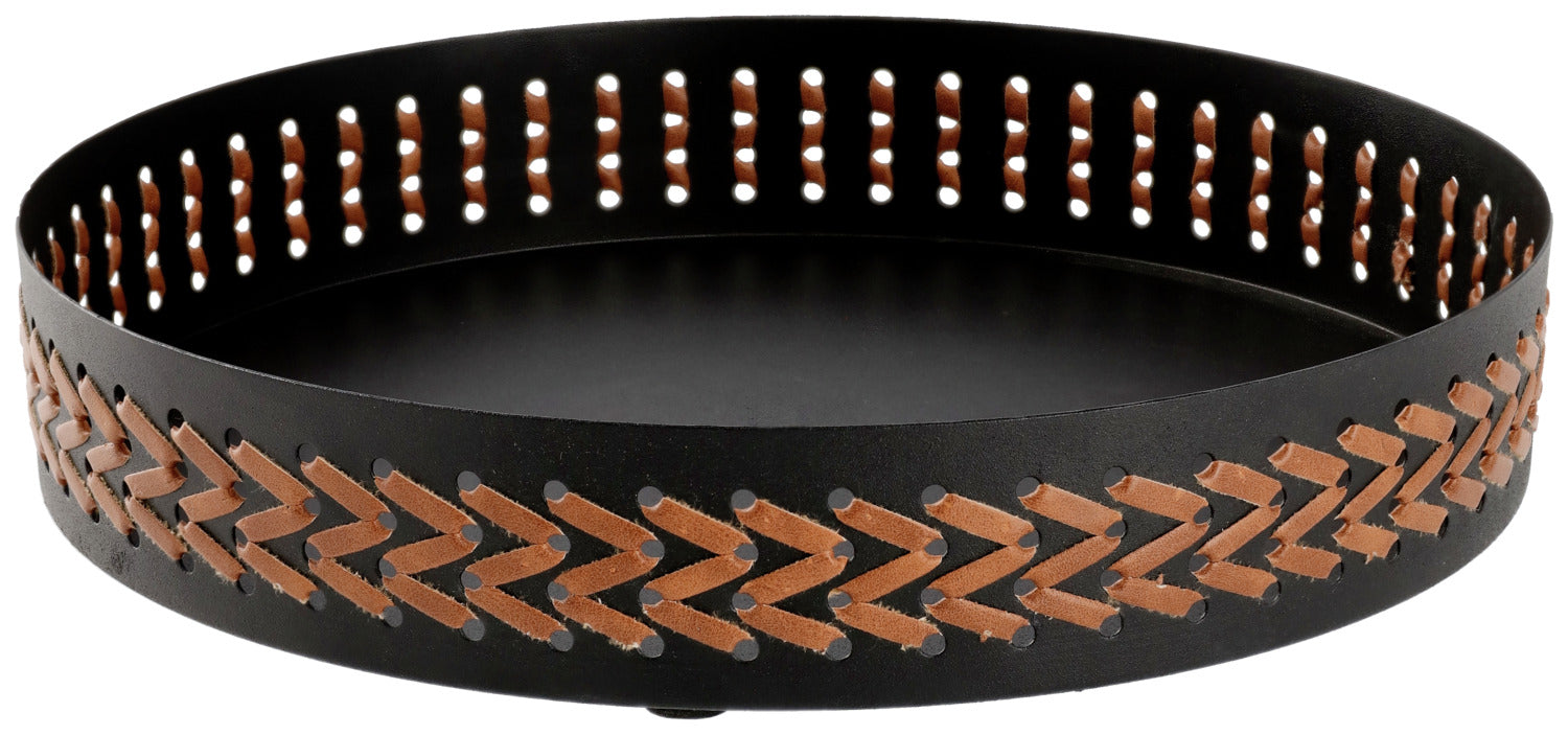 Metalowa taca dekoracyjna z detalami z wegańskiej skóry.