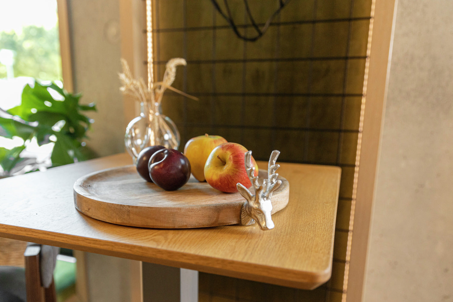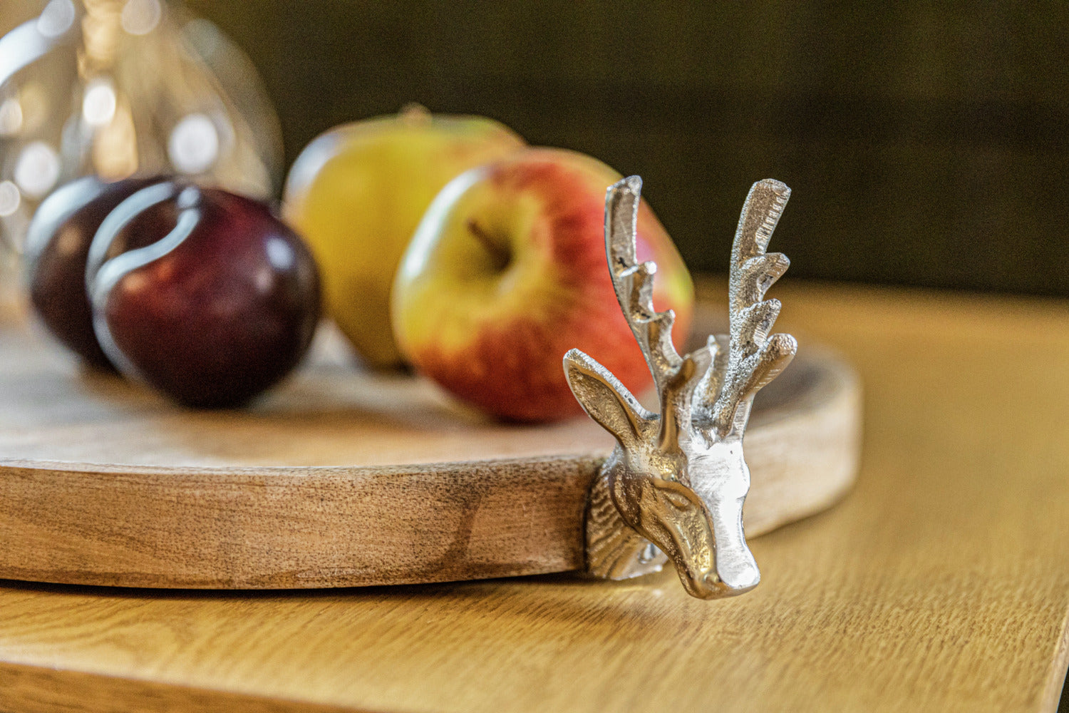 Rustykalny talerz dekoracyjny wykonany z drewna mango z ozdobnymi głowami jelenia wykonanymi z aluminium. Nie nadaje się do mycia w zmywarce.