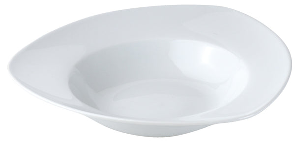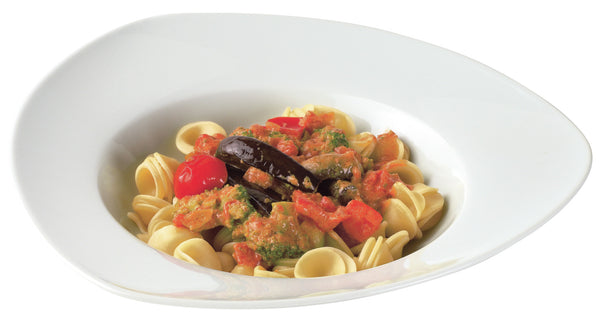 Talerz do makaronu wykonany z białej porcelany, w trójkątnym kształcie. Bardzo głęboki, z gładkim, lekko opadającym brzegiem. Można myć w zmywarce i używać w kuchence mikrofalowej.