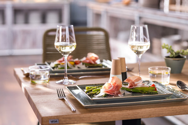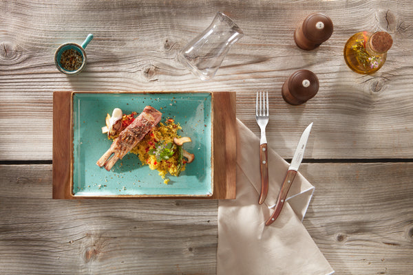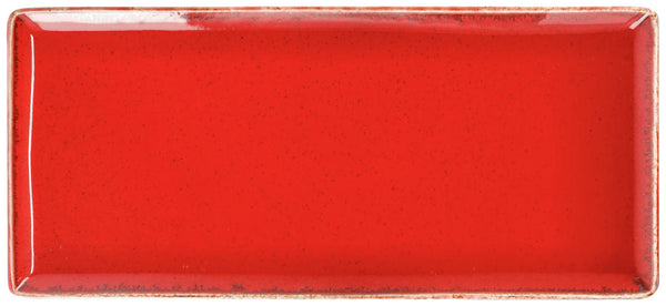 Kolorowy talerz wykonany z porcelany, o wyglądzie ceramiki. Wyróżnia go prostokątny kształt oraz lekko nieregularne krawędzie. Można myć w zmywarce i używać w kuchence mikrofalowej.