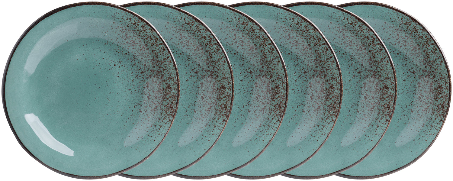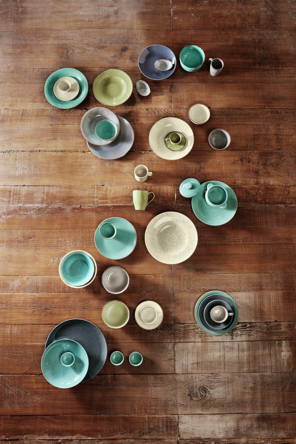 Talerz z kolorowej kamionki z nieregularnymi brzegami i plamkami. Każdy element jest wyjątkowy. Można myć w zmywarce i używać w kuchence mikrofalowej.
