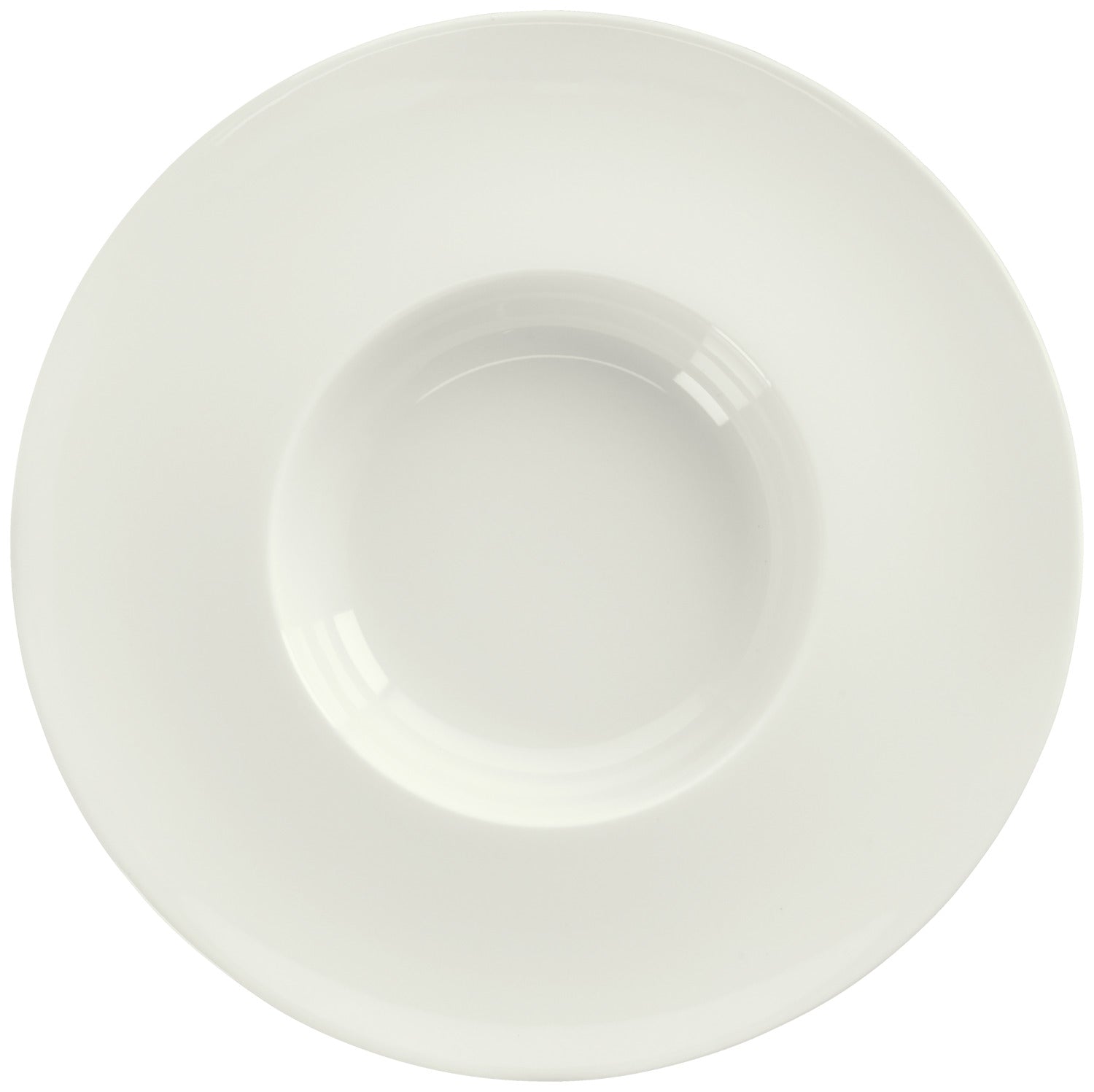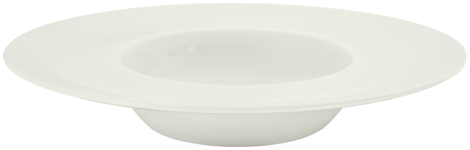 Talerz do makaronu z szerokim rantem wykonany z porcelany o lekko kremowym kolorze. Nowoczesny design z wyraźnymi liniami. Wysoka odporność. Wspaniałe szkliwo. Można myć w zmywarce i używać w kuchence mikrofalowej.