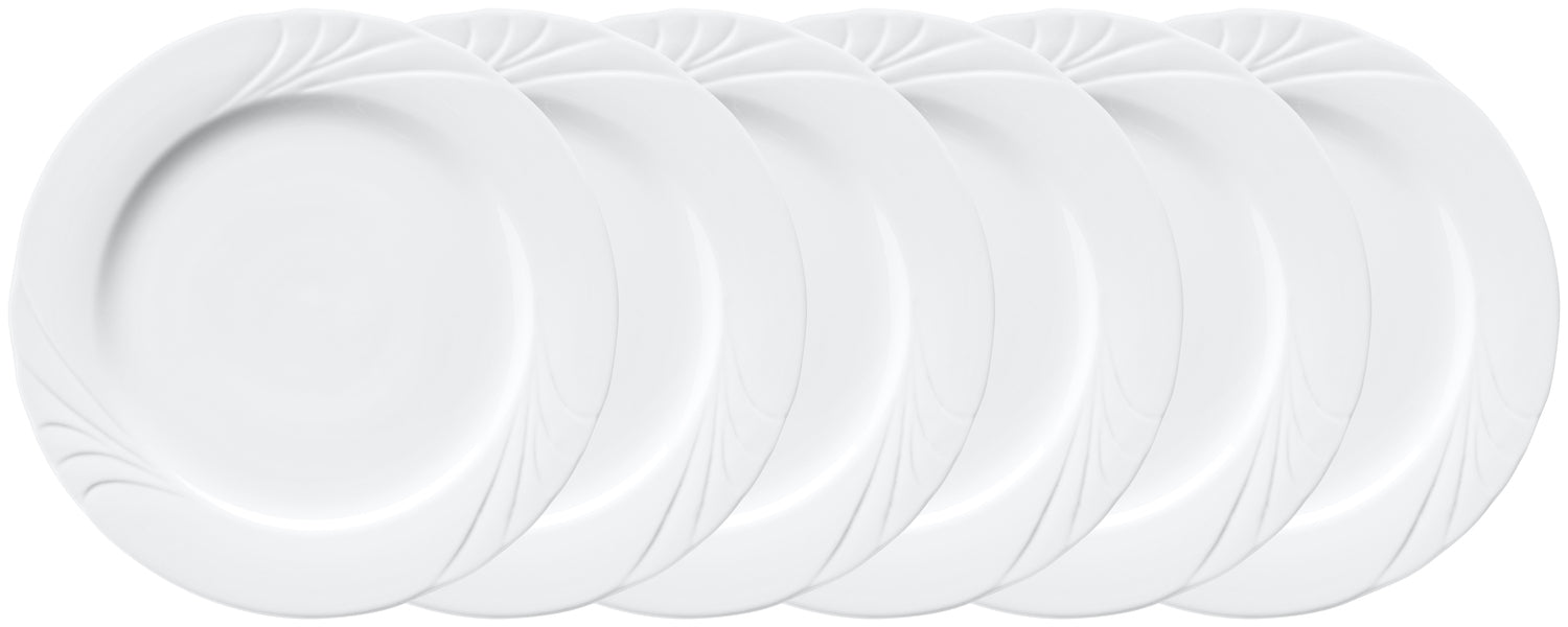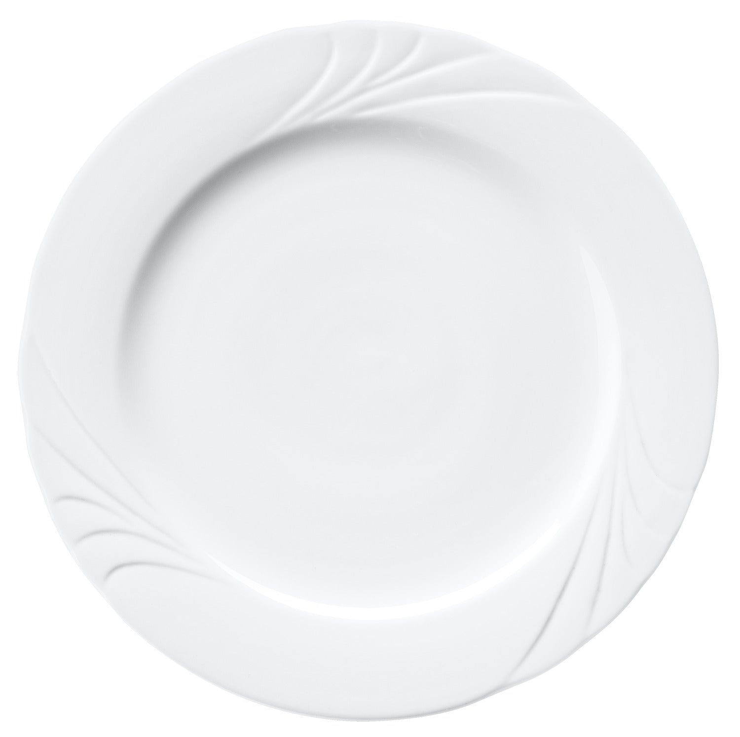 Talerz z białej porcelany ozdobiony prosty reliefem. Można myć w zmywarce i używać w kuchence mikrofalowej.