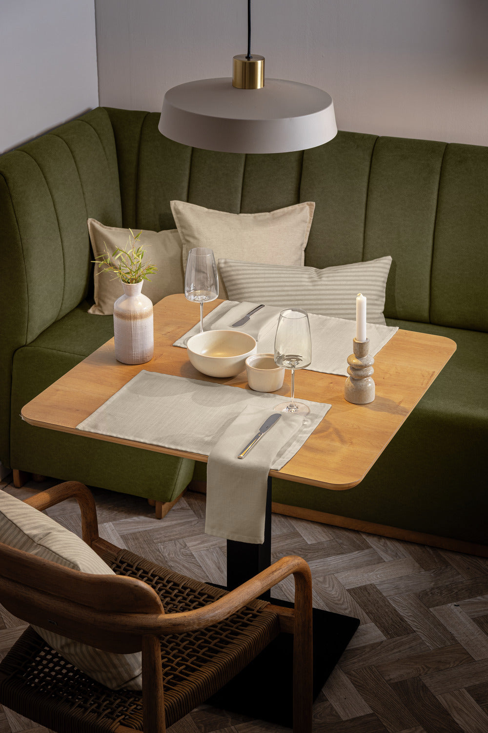 Serwetki z tkaniny mieszanej z wysoką zawartością lnu Ledana oferują naturalne akcenty na Twoim stole. Wykonane w 50% z lnu i w 50% z poliestru serwetki Ledana łączą w sobie łatwość pielęgnacji z eleganckim, naturalnym wzornictwem. Strukturalny materiał zapewnia przyjemny dotyk i autentyczny wygląd. Ledana tworzy stylowe, naturalne akcenty i doskonale harmonizuje z różnymi dekoracjami stołu. Tkanina: 50% len, 50% poliester. Gramatura ok. 280 g/m². Łatwy w pielęgnacji i trwały materiał. Wykończone 1 cm standardowym obszyciem. Możliwość personalizacji.