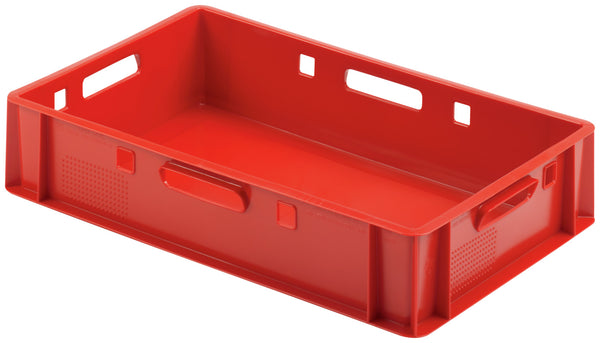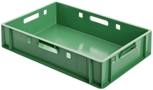 Pudełka sztaplowane, w ustandaryzowanym rozmiarze Euro wykonane z wytrzymałego twardego polietylenu. Idealne do transportu i przechowywania. Nadają się do kontaktu z żywnością i mycia w zmywarce. Wymiary wewnętrzne dla 25,1 litra: 56,8 x 36,8 x 12 cm, dla 41,3 litra: 5,68 x 36,8 x 19,8 cm.
