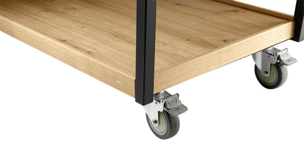 Wózek do serwowania wykonany z malowanej proszkowo stalowej ramy z 3 półkami wykonanymi z drewna i listwami z litego drewna dębowego. Wózek kelnerski łączy w sobie funkcjonalność i estetykę na najwyższym poziomie. Solidna, spawana rama ze stali malowanej proszkowo zapewnia długą żywotność, a trzy półki oferują wystarczającą ilość miejsca do różnych zastosowań. Niezależnie od tego, czy chodzi o branżę gastronomiczną, czy hotelarską, ten wózek jest niezbędnym narzędziem do profesjonalnej obsługi. Płynnie obracające się kółka umożliwiają przemieszczanie wózka bez wysiłku, nawet przy pełnym obciążeniu. Dzięki hamulcom postojowym wózek stoi bezpiecznie w miejscu. Stalowa rama jest już zmontowana, należy tylko przymocować kółka i włożyć deski. 3 przestronne półki zapewniają świetny transport i prezentację żywności, napojów, akcesoriów stołowych, takich jak sztućce, serwetki itp. Każda półka jest stabilna i ma nośność do 25 kg na poziom. Gumowe kołki umieszczone na ramie zapobiegają ślizganiu się półek. Tylne kółka o średnicy 200 mm wykonane z pełnej gumy. 2 przednie kółka o średnicy 125 mm z pełnej gumy z hamulcem. Dostępne w kolorach dąb dziki i dąb antyczny, pasujących do serii Baristo.
