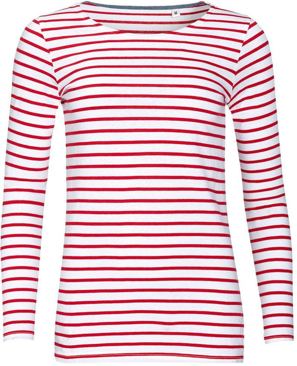 Wygodna, bawełniana koszulka damska z długim rękawem. Wzór w paski dostępny w dwóch połączeniach kolorystycznych. Koszulkę wyróżnia dopasowany krój, kobiecy, okrągły dekolt oraz taśma napotna w kolorze chambray.