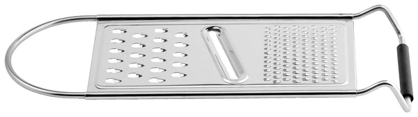 Uniwersalna tarka wykonana ze stali nierdzewnej. Do tarcia, krojenia i szatkowania. Ostra powierzchnia tarki i drut o średnicy 5 mm. Z antypoślizgową powierzchnią. Trzy warianty ostrzy na jednej tarce jako tarka drobna, gruba i krajalnica.