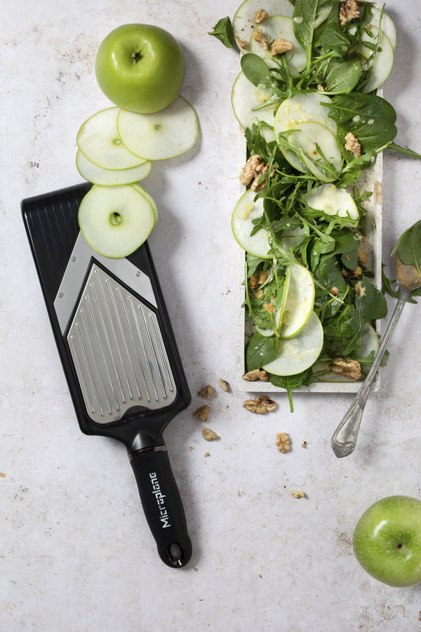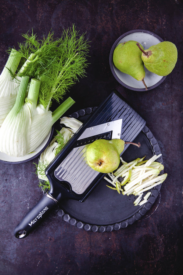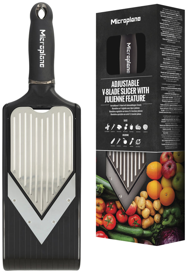 Krajalnica w kształcie litery V z wkładanym ostrzem julienne. Dwustronna wkładka do obracania. Ergonomiczny, miękki w dotyku uchwyt. Ostre jak brzytwa ostrze V ze stali nierdzewnej kroi owoce, warzywa i sery bez wysiłku. Bezstopniowa regulacja.