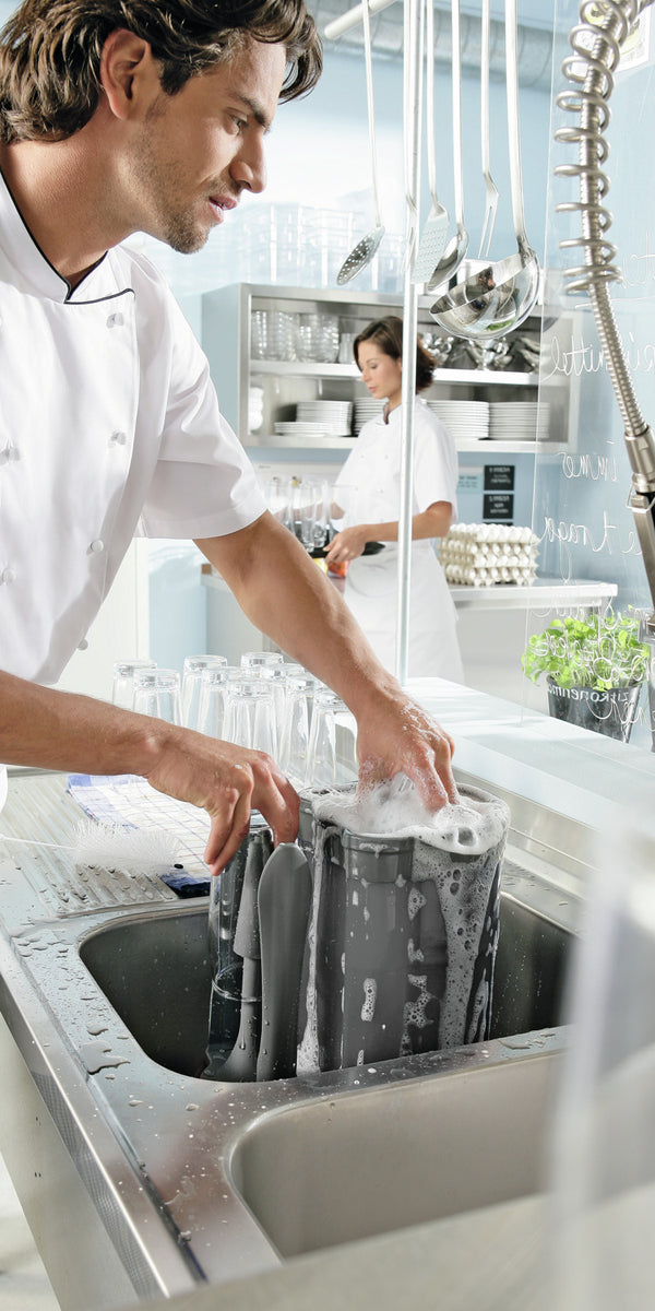 Myjka ciśnieniowa do szkła z teleskopowym systemem płukania wykonanym z wytrzymałego tworzywa sztucznego. Szklanki są szczotkowane, czyszczone i spłukiwane bieżącą wodą. Podłączenie do płukania z gwintem 3/8 cala.