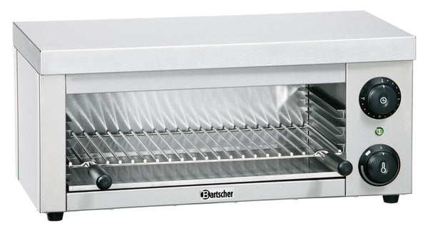 Urządzenie do zapiekania lub grillowania. Obudowa, ruszt i tacka wykonane ze stali nierdzewnej chromowo-niklowej 18/10. Kontroler temperatury od 50° do 300°C. Z timerem, regulowanym do 15 minut. Kontrolka ogrzewania. W zestawie ruszt z dwoma uchwytami i tacka ociekowa na tłuszcz. Dwuletnia gwarancja. Przyłącze: 2,0 kW/230 V; Waga: 14kg.