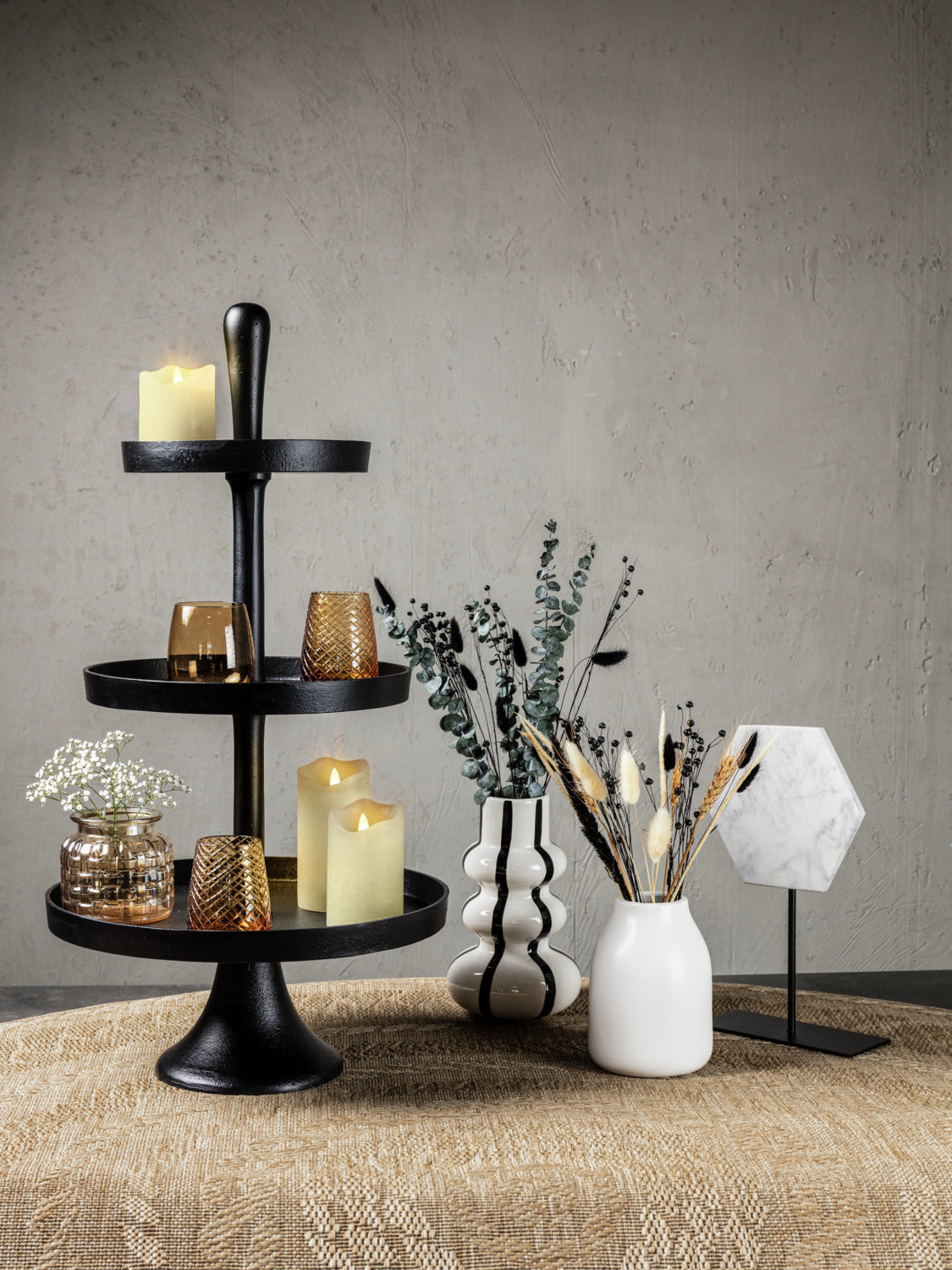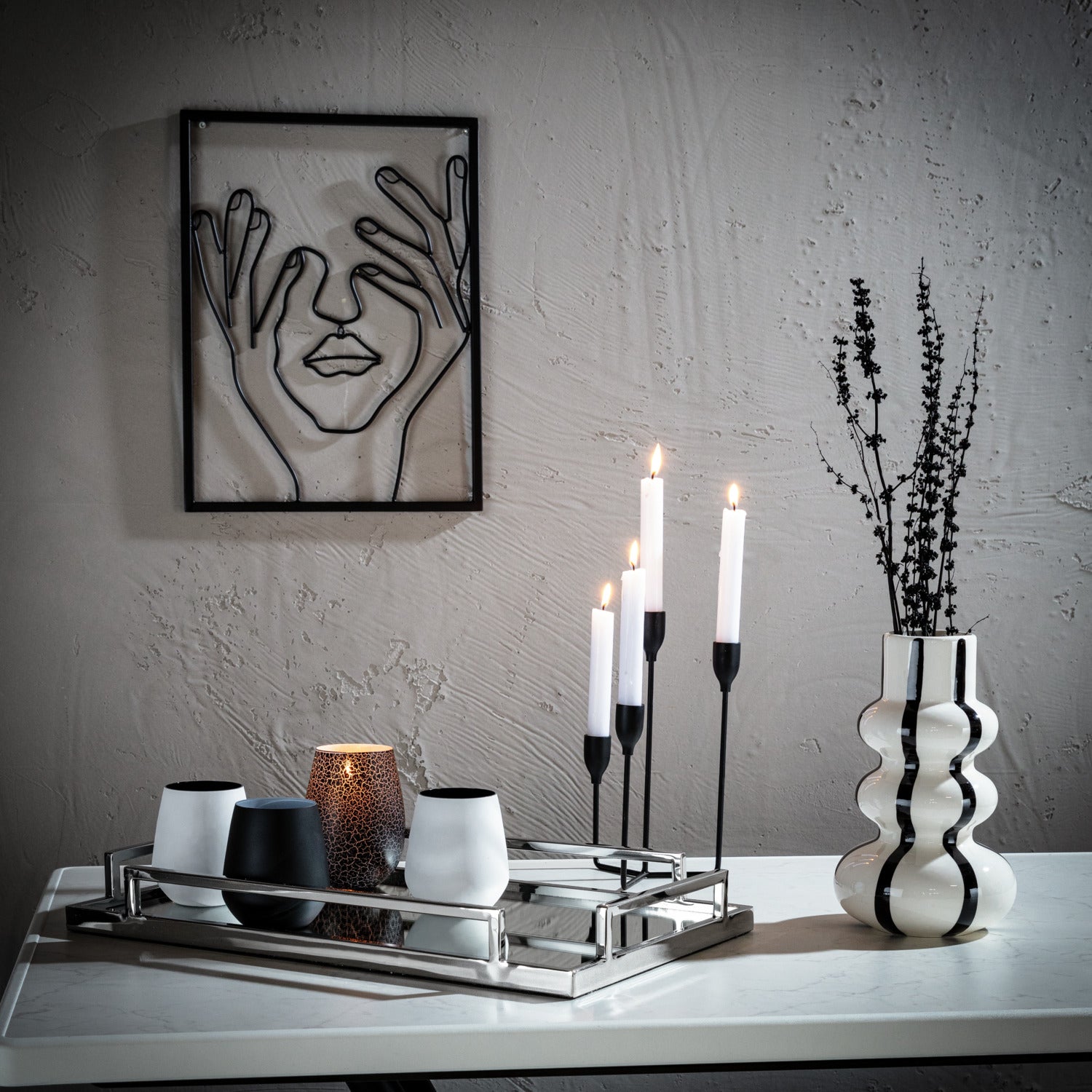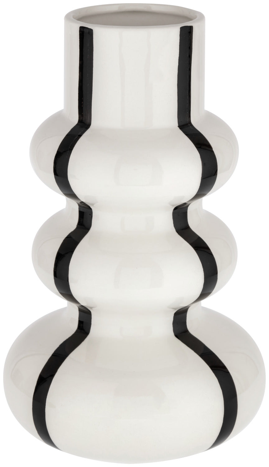 Porcelanowy wazon w paski o nietypowym, nowoczesnym kształcie.