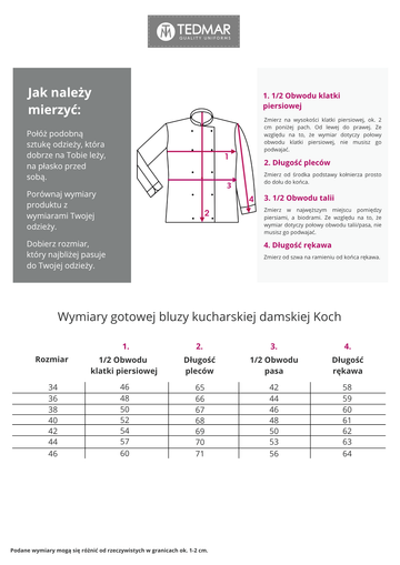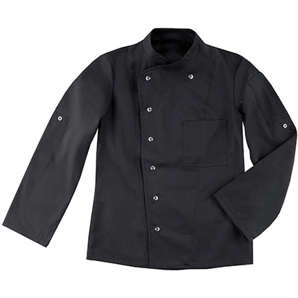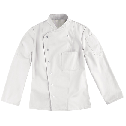 Elegancka, lekko dopasowana bluza kucharska z asymetrycznym przodem i zapięciem na zatrzaski. Zintegrowana tasiemka ułatwia podwinięcie rękawa. Kieszeń na lewej piersi i kieszonka na ramieniu zapewniają miejsce do przechowywania niezbędnych przyborów. Rozcięcie z tyłu ułatwia ruch podczas pracy. Tkanina wyróżnia się trwałością, małą gniotliwością, łatwością pielęgnacji i wytrzymałością na pranie w wysokich temperaturach.