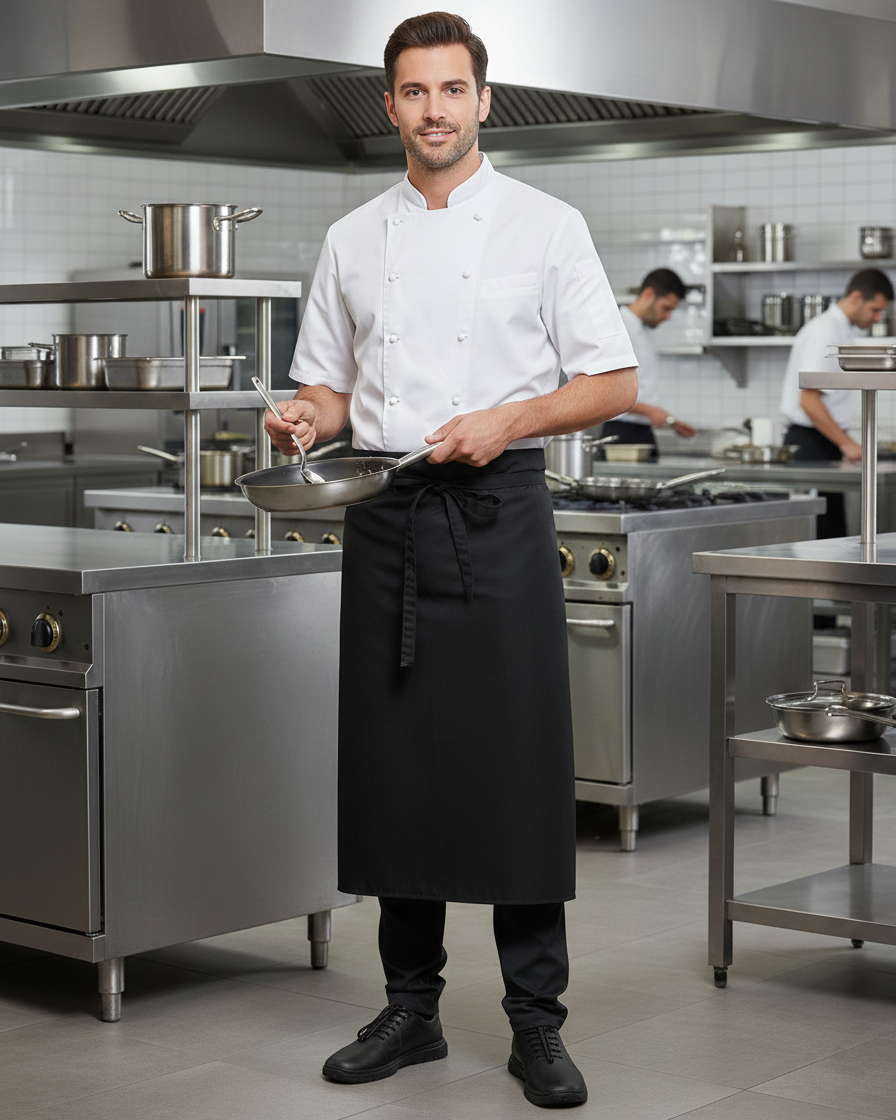 Długa zapaska bez kieszeni wykonana z tkaniny mieszanej wyprodukowanej z dbałością o środowisko. Tkanina łączy włókna bawełny organicznej z poliestrem z recyklingu butelek. Zapaska wyróżnia się trwałym kolorem, małą gniotliwością, łatwością pielęgnacji i wytrzymałością na pranie w wysokich temperaturach. Wiązana w pasie za pomocą troków z tkaniny zasadniczej. Wymiary: 100 x 80 cm (szer. x dł.)