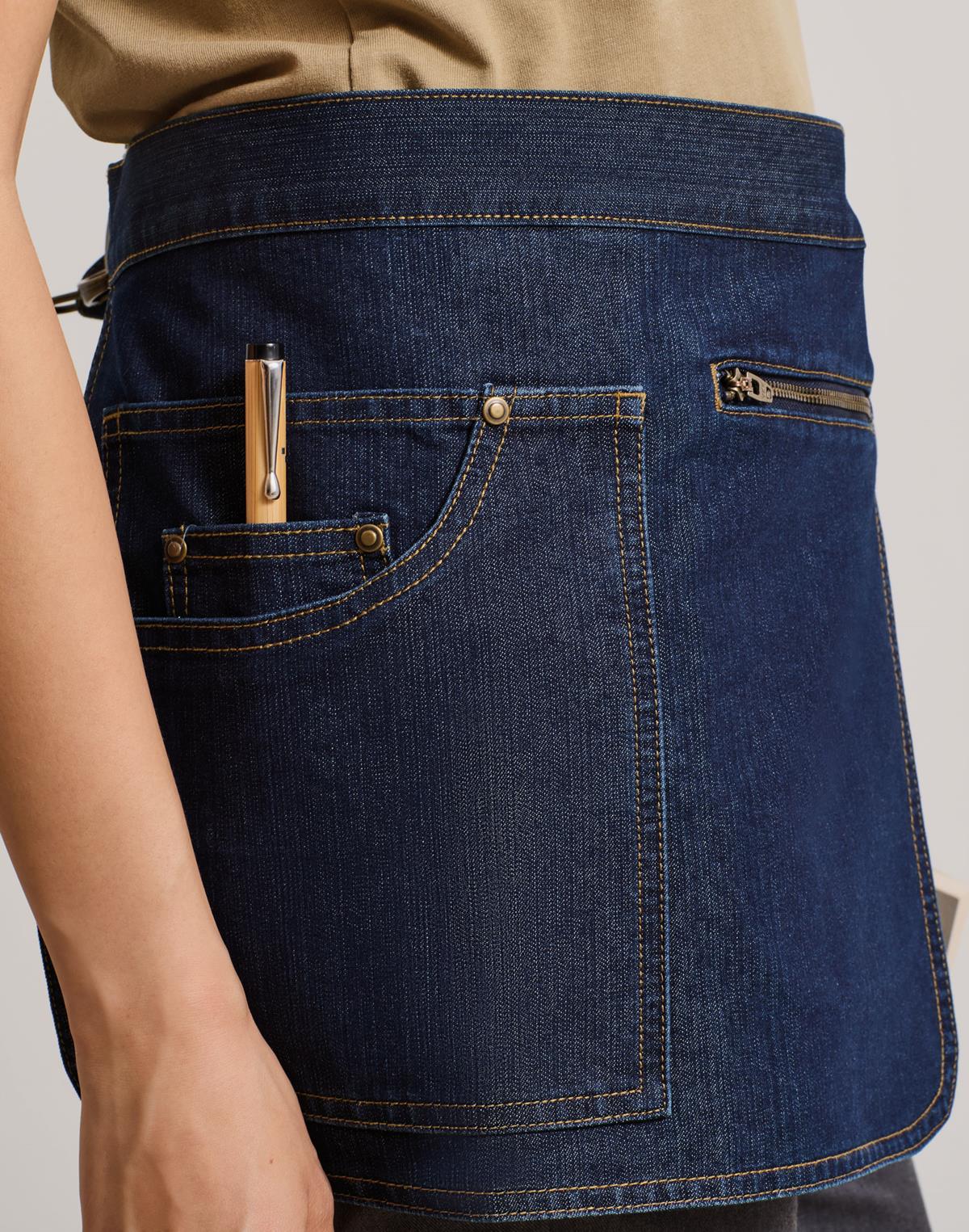 Krótka, dżinsowa zapaska z dużą ilością praktycznych kieszonek: trzy naszywane oraz jedna zapinana na suwak. Model posiada troki z tkaniny do regulacji w talii, zaokrąglony dół, metalową sprzączkę i klamerkę do regulacji obwodu. Wymiary otwartej kieszeni: 18,5 x 20 cm (szer. x wys.). Wymiary zapinanej kieszeni: 16 x 16 cm (szer. x wys.)