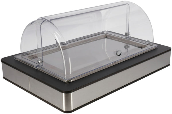 Witryna chłodnicza wykonana z wysokiej jakości szczotkowanej stali nierdzewnej 18/10 z panelem laminowanym w kolorze antracytowym, z podstawą z wysokiej jakości tworzywa sztucznego odpornego na temperaturę do 70°C, z pasującym opakowaniem chłodzącym z z polietylenu, ze sztaplowanym talerzem ze stali nierdzewnej chromowo-niklowej 18/8 w rozmiarze GN z antypoślizgowymi nóżkami oraz z nietłukącą osłoną Sturgis z wysokiej jakości Tritanu (bez bisfenolu A) z antypoślizgowymi gumowymi ogranicznikami do cichego otwierania i zamykania. Talerz można myć w zmywarce, wszystkie inne części nie.