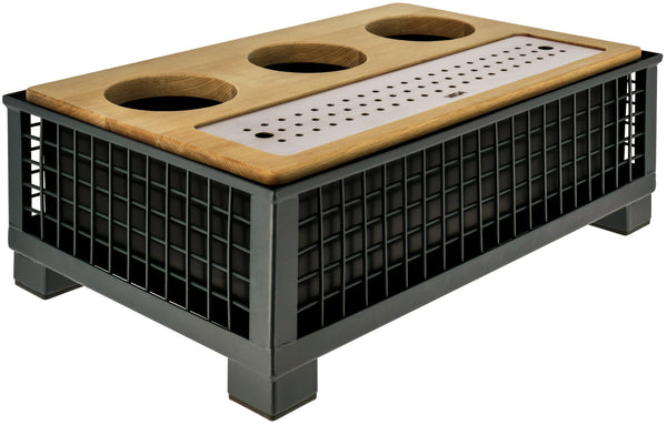 Stojak na karafki składa się ze sztaplowanej skrzyni podstawowej 1/1 wykonanej ze stali malowanej proszkowo, podstawy z wysokiej jakości tworzywa sztucznego o odporności termicznej do 70°C, dopasowanego wkładu chłodzącego z polietylenu, nakładki na karafki z litego buku lub dębu, tacki ociekowej ze stali nierdzewnej 18/10 oraz tacki ociekowej z tworzywa sztucznego. Tacę ociekową można myć w zmywarce, wszystkie inne części nie.