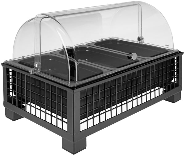 Witryna chłodnicza składa się ze sztaplowanej skrzynki podstawowej ze stali malowanej proszkowo, podstawy z wysokiej jakości tworzywa sztucznego o odporności termicznej do 70°C, pasującego wkładu chłodzącego z polietylenu, 3 x czarnego, sztaplowanego, odpornego na uderzenia i nietłukącego pojemnika GN 1/3 o głęb. 6,5cm wykonanego z melaminy (zakres zastosowania: -30°C do +70°C) oraz nietłukącej osłony Sturgis z wysokiej jakości Tritanu (bez bisfenolu A) z antypoślizgowymi gumowymi ogranicznikami do cichego otwierania i zamykania. Pojemnik GN można myć w zmywarce, wszystkie inne części nie.