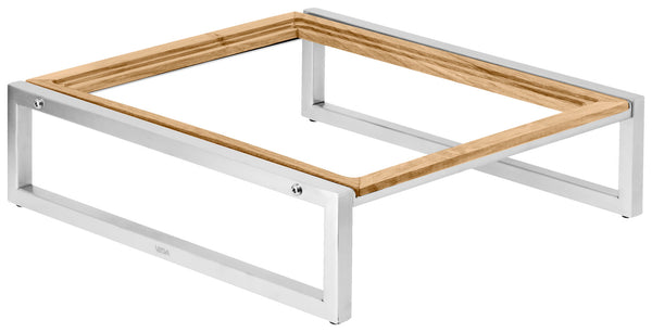 Stojak w standardzie GN wykonany z ramy z litego dębu i stelaża ze stali nierdzewnej 18/5. Zakres dostawy obejmuje niski stelaż GN 1/2 oraz ramę do pojemników GN i tac GN. Pojemniki GN lub tace GN należy zamawiać oddzielnie. Dostarczane w stanie rozmontowanym - łatwy montaż. Stelaże można ustawiać jeden na drugim. Projekt własny firmy VEGA. Nie można myć w zmywarce.