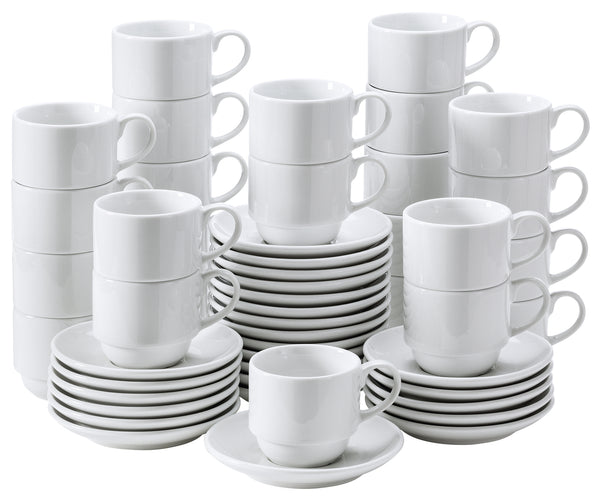Filiżanki ze spodkami z białej porcelany. Klasyczny kształt z gładkim brzegiem. Zestaw składa się z 25 filiżanek do kawy 0,2 l i 25 spodków do kawy Ø 13,5 cm. Można myć w zmywarce i używać w kuchence mikrofalowej.