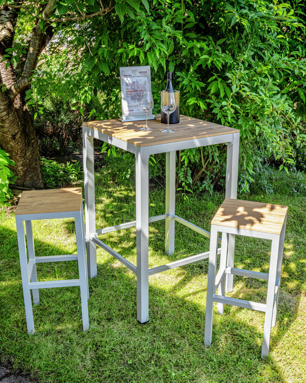 Ten odporny na warunki atmosferyczne zestaw do siedzenia Resistance, składający się z dwóch stołków barowych Resistance i pasującego do nich stołu barowego Resistance, jest idealny do użytku na zewnątrz i zachęca do spędzania relaksujących godzin na świeżym powietrzu. Krzesła i stół do użytku na zewnątrz wykonane są z lekkiego, malowanego proszkowo aluminium (grubość materiału 1,5 cm). Siedzisko i blat stołu wykonane są z plastikowych listew o grubości 1,5 cm o wyglądzie drewna tekowego. Możliwość sztaplowania, odporność na warunki atmosferyczne i promieniowanie UV. Z plastikowymi ślizgaczami podłogowymi. Wysoki stół jest dostarczany w stanie zdemontowanym, z dołączonym materiałem mocującym. Uwaga: Stoły zewnętrzne z plastikowymi listwami o wyglądzie drewna mają wiele zalet w porównaniu ze stołami z drewnianymi blatami. Podczas korzystania z tych stołów należy jednak pamiętać o kilku kwestiach: Szklanki lub inne szklane przedmioty, takie jak popielniczki lub wazony, mogą powodować efekt soczewki w bezpośrednim świetle słonecznym, co może spowodować uszkodzenie powierzchni.