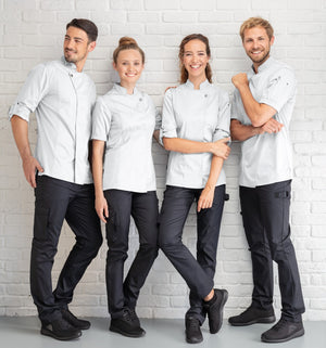 A nieoficjalnie? Jesteśmy zespołem ludzi, którzy uwielbiają projektować, szyć, sprzedawać i dostarczać ubrania do pracy dla najlepszych, a także pomagać restauracjom i hotelom w wyposażeniu ich przestrzeni.