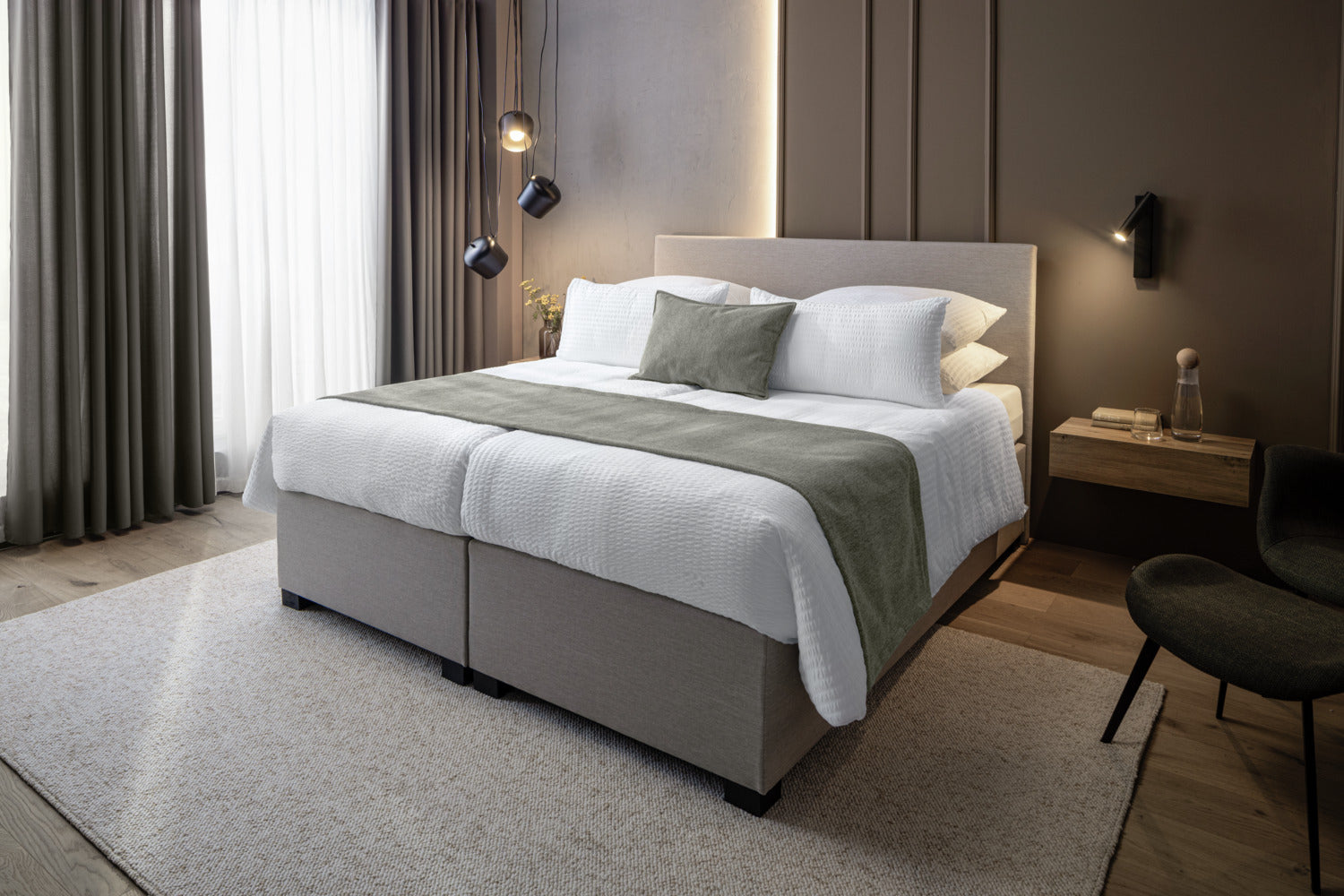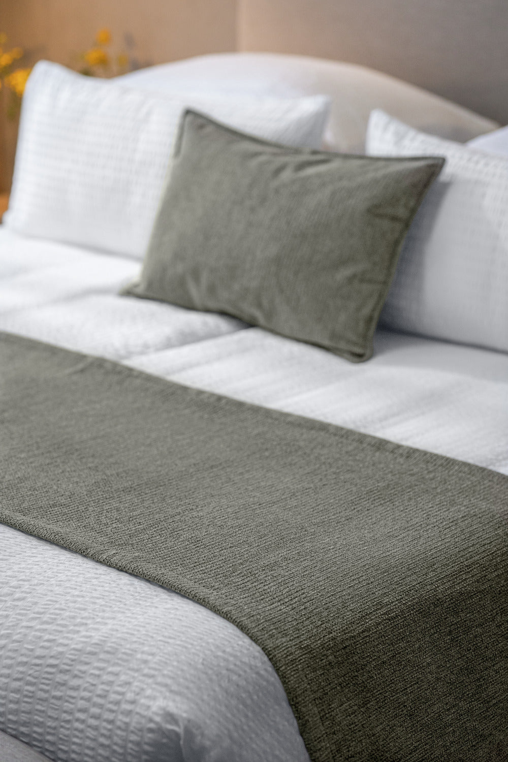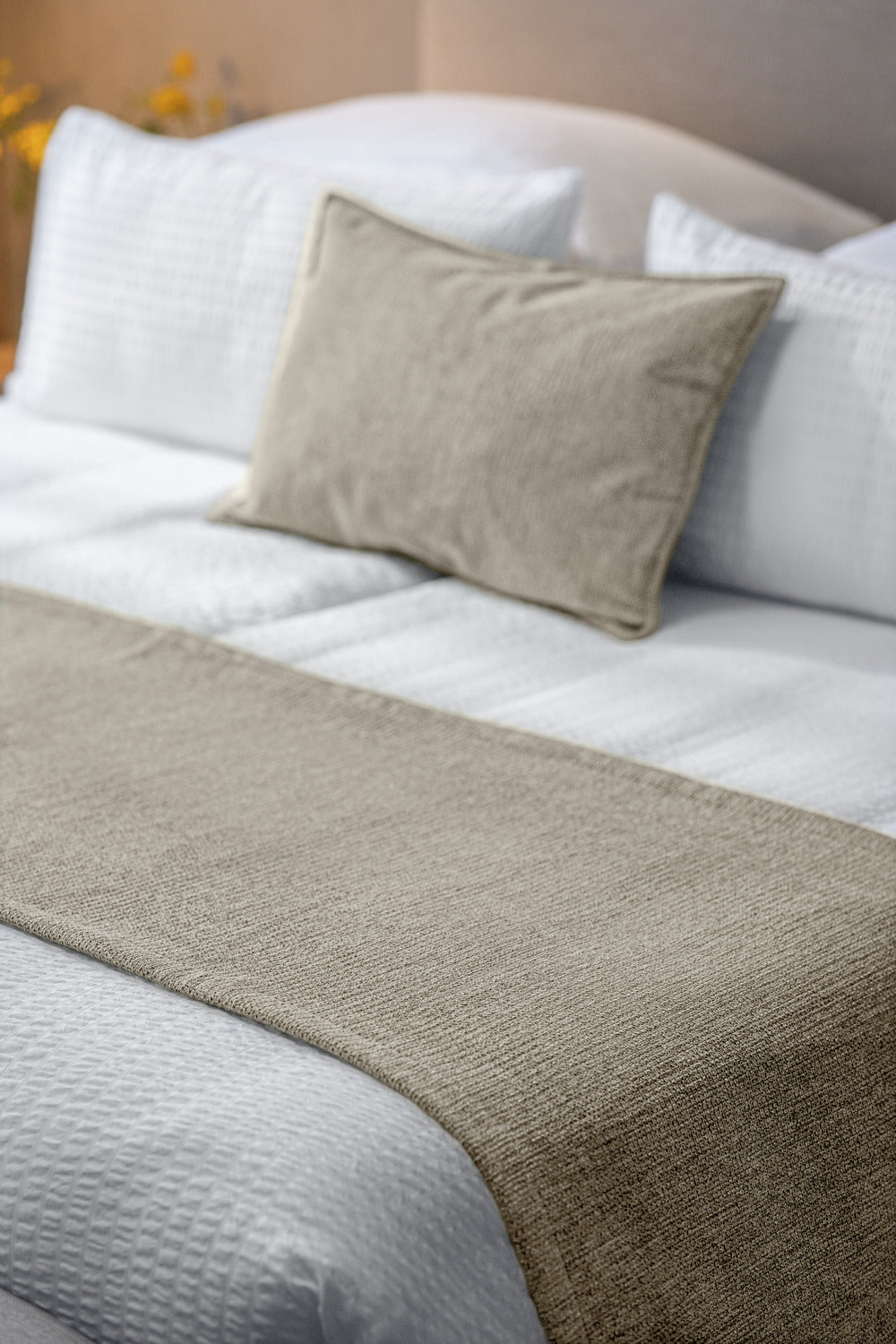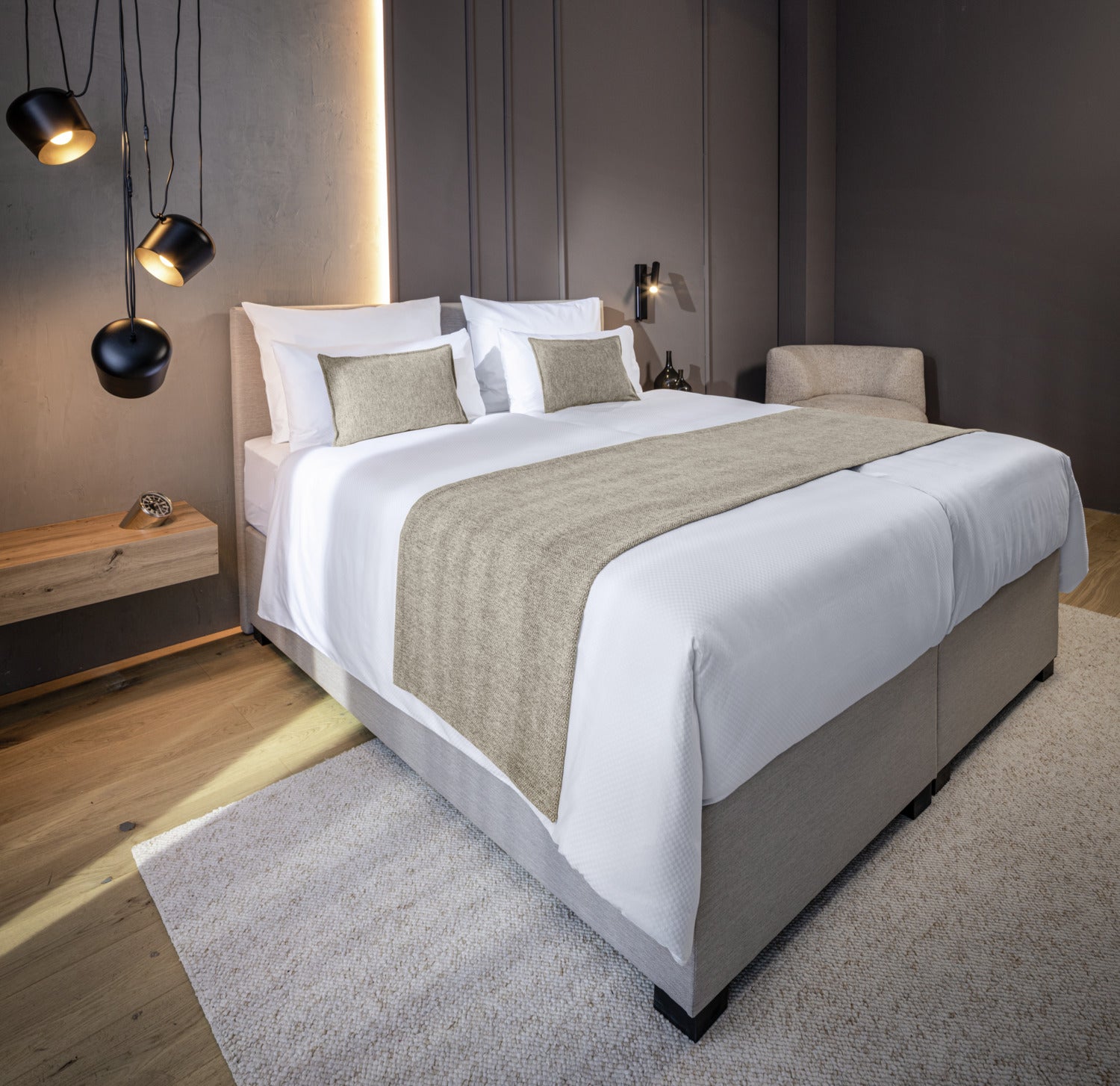Wytrzymały bieżnik na łóżko z wodoodpornym wykończeniem i kopertowym obszyciem. Bieżnik Maella jest wykonany z wysokiej jakości tkaniny mieszanej poliestrowo-poliamidowej, posiada specjalne wykończenie hydrofobowe i nie wymaga prasowania. Powłoka chroni przed wilgocią i zabrudzeniami, dzięki czemu bieżnik idealnie nadaje się do wymagających codziennych zastosowań hotelowych. Klasyczne kopertowe obszycie nadaje mu elegancki i ponadczasowy wygląd, który harmonijnie komponuje się z każdym pokojem hotelowym. Wytrzymały bieżnik na łóżko wykonany w 96% z poliestru i w 4% z poliamidu - o gramaturze ok. 350 g/m². Wodoodporne wykończenie chroni pościel przed wilgocią i zabrudzeniami.