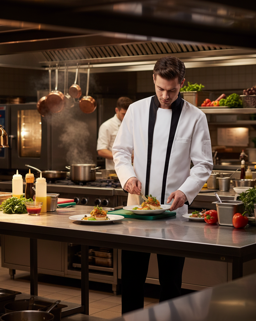 Modna marynarka kucharska z długim rękawem oraz kontrastową lamówką na rozcięciu dołu. Posiada kontrastowy guzik w mankiecie rękawa, kontrastowe wstawki na przodzie i kontrastową stójkę. Zapięcie na napy ułatwia zakładanie.