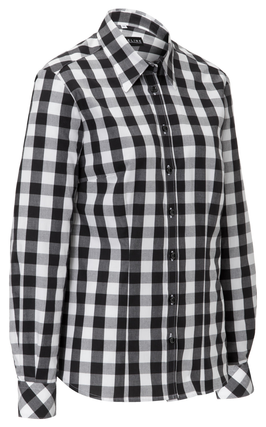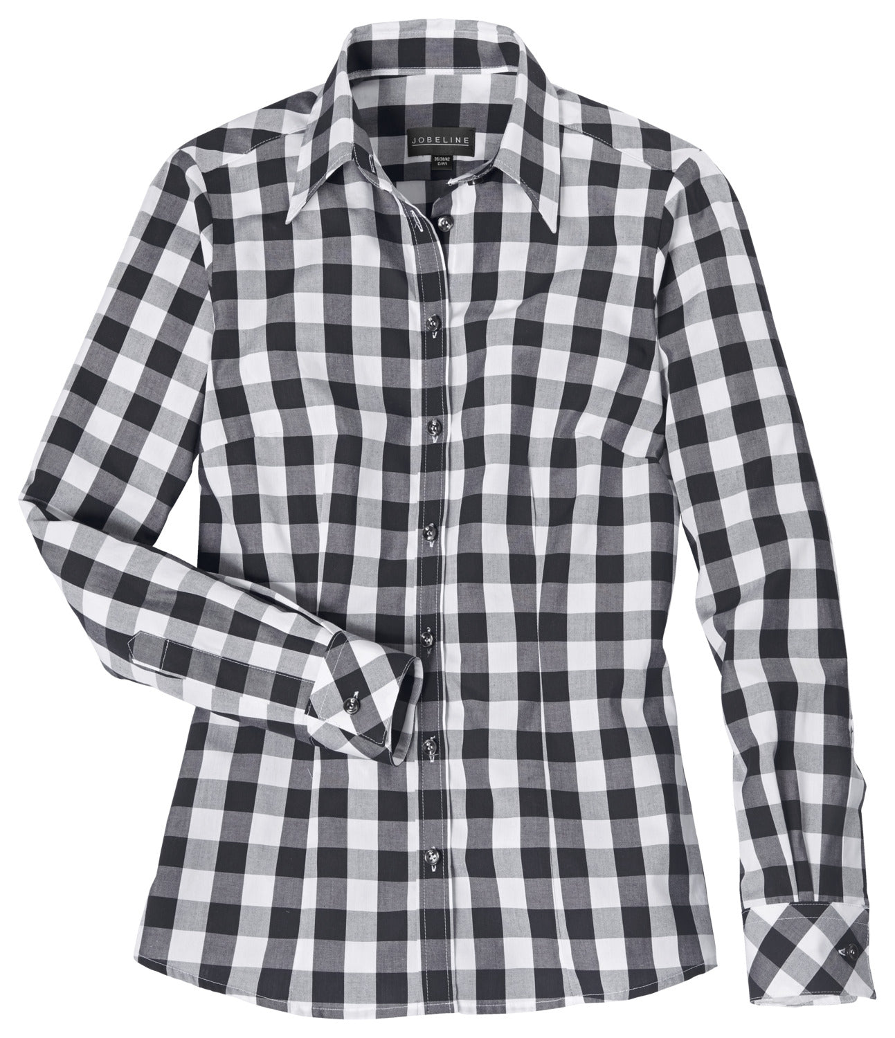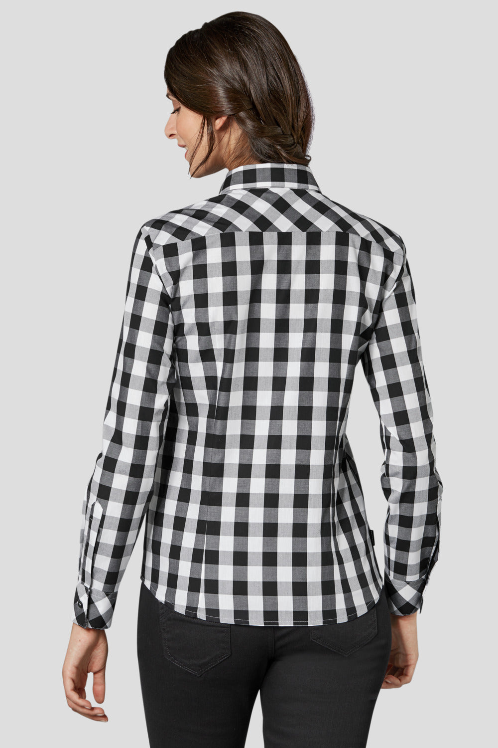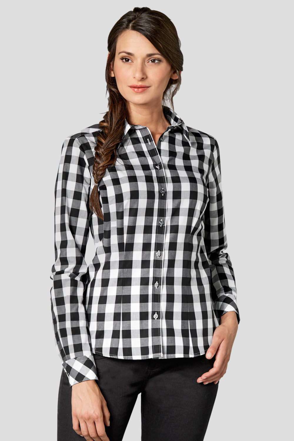 Klasyczna bluzka damska w dużą kratę, z długimi rękawami, karczkiem z tyłu, zapięciem na guziki, kołnierzykiem koszulowym i mankietami. Ta łatwa w pielęgnacji bluzka ma dopasowany krój i jest dostępna również z rękawami trzy czwarte. Najwyższa jakość i maksymalny komfort. Długość pleców: 64 cm w rozmiarze 36. 100% bawełna. Pranie w 40°.