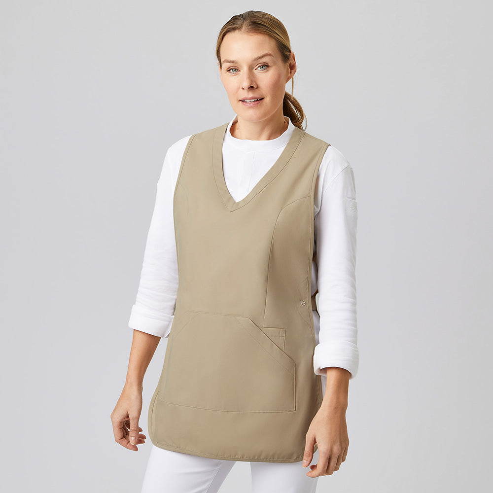 Fartuch damski wykonany z miękkiej w dotyku tkaniny mieszanej z wysoką zawartością bawełny. Wygodny do noszenia i łatwy w pielęgnacji. Zapewnia szybkie i łatwe dopasowanie dzięki regulacji zatrzaskami po bokach. Dekolt w kształcie litery V dodaje uroku, a duża kieszeń główna i wąska przegroda na długopis oferują miejsce na akcesoria.