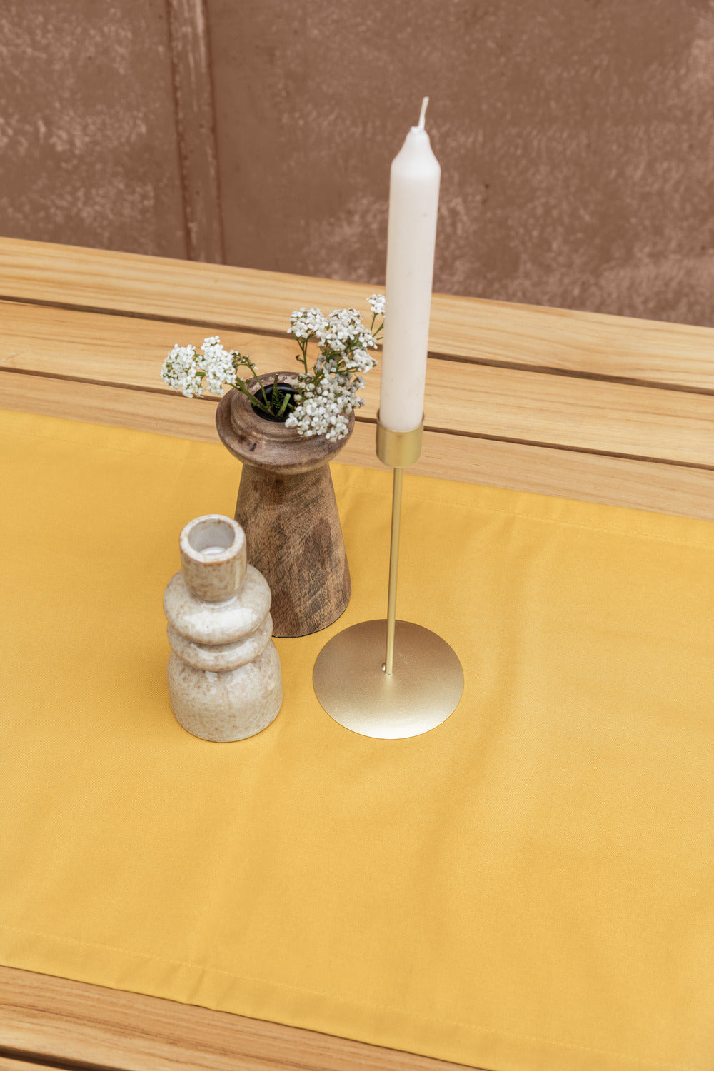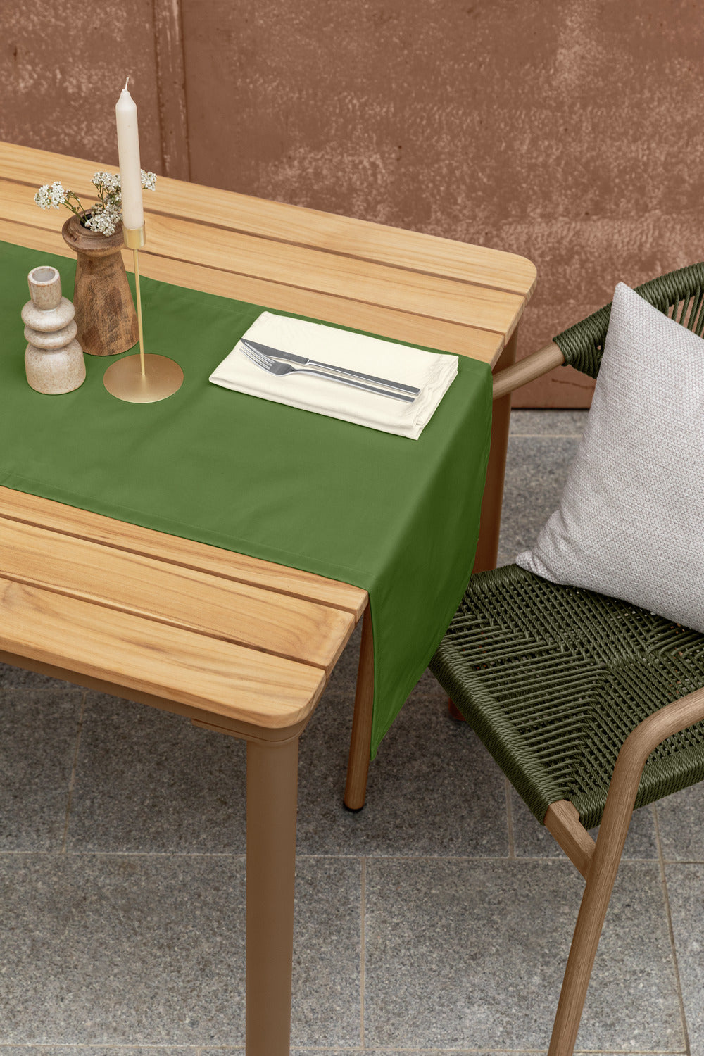 Bieżnik na stół zewnętrzny Lasolana - odporny na plamy i światło. Bieżnik Lasolana jest idealny do użytku na zewnątrz. Wykonany w 52% z poliestru i w 48% z bawełny, jest niezwykle wytrzymały i trwały. Specjalna powłoka akrylowa sprawia, że bieżnik jest odporny na plamy, wodę i zabrudzenia, a jednocześnie jest łatwy w czyszczeniu. Prosty, monochromatyczny design w świeżych, letnich kolorach wniesie żywe akcenty na stół. Dzięki wysokiej odporności na światło, kolory pozostają żywe nawet po długim wystawieniu na działanie promieni słonecznych. Funkcjonalność i design w doskonałej harmonii! Tkanina mieszana wykonana w 52% z poliestru i 48% z bawełny. Gramatura ok. 190 g/m². Akrylowa powłoka zapewnia odporność na plamy i wodę. Odporny na plamy i można go czyścić wilgotną szmatką. Wysoka odporność na światło, trwałość koloru nawet przy promieniowaniu UV. Ze standardowym szwem 1 cm. Do użytku wewnątrz i na zewnątrz budynków. Wskazówka dotycząca pielęgnacji: Prasować na odwrocie po każdym praniu, aby aktywować powłokę i zapewnić trwałość - nie nadaje się do magla.