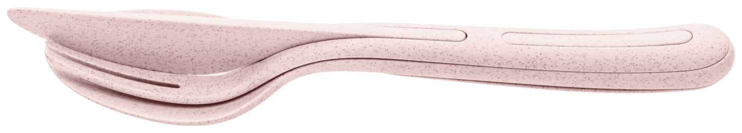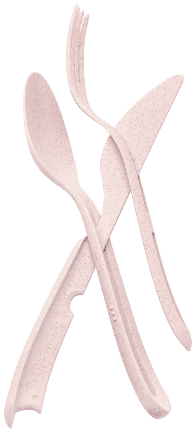 Zrównoważone wzornictwo. Zestaw sztućców składający się z noża, widelca i łyżki wykonanych z czystego plastiku i włókien drzewnych. Tworzywo sztuczne jest pozyskiwane wyłącznie ze zużytego oleju słonecznikowego i rzepakowego pochodzącego z przemysłu i gastronomii. Włókna drzewne są pozyskiwane z drzew pozostałych po pielęgnacji lasów i z odpadów z produkcji papieru. Wszystkie części sztućców można złożyć i ponownie rozłożyć. Aby je odłączyć, wystarczy podnieść nóż za czubek i wyciągnąć go w dół. Wszystkie części wygodnie leżą w dłoni. KLIKK to ikona "dobrego designu z czystym sumieniem". Jest alternatywą dla wszystkich jednorazowych sztućców, ponieważ jest przyjazny dla środowiska, bezpieczny dla żywności i w 100% nadaje się do recyklingu. Są również niezwykle trwałe, solidne i oczywiście można je myć w zmywarce. Odpowiednie do gorących potraw - do maks. +200°C. Odporne na wysoką temperaturę.
